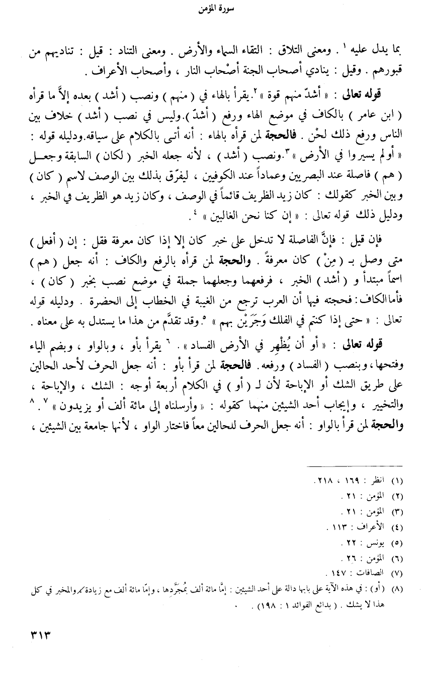 فإن قيل: فإنّ الفاصلة لا تدخل على خبر كان إلا إذا كان معرفة فقل: إن (أفعل) متى وصل ب (من) كان معرفة. والحجة لمن قرأه بالرفع والكاف: أنه جعل (هم) اسما مبتدأ و (أشد) الخبر، فرفعهما وجعلهما جملة في موضع نصب بخبر (كان)، فأما الكاف: فحجته فيها أن العرب ترجع من الغيبة في الخطاب إلى الحضرة. ودليله قوله تعالى: حَتَّى إِذا كُنْتُمْ فِي الْفُلْكِ وَجَرَيْنَ بِهِمْ «5». وقد تقدّم من هذا ما يستدل به على معناه.