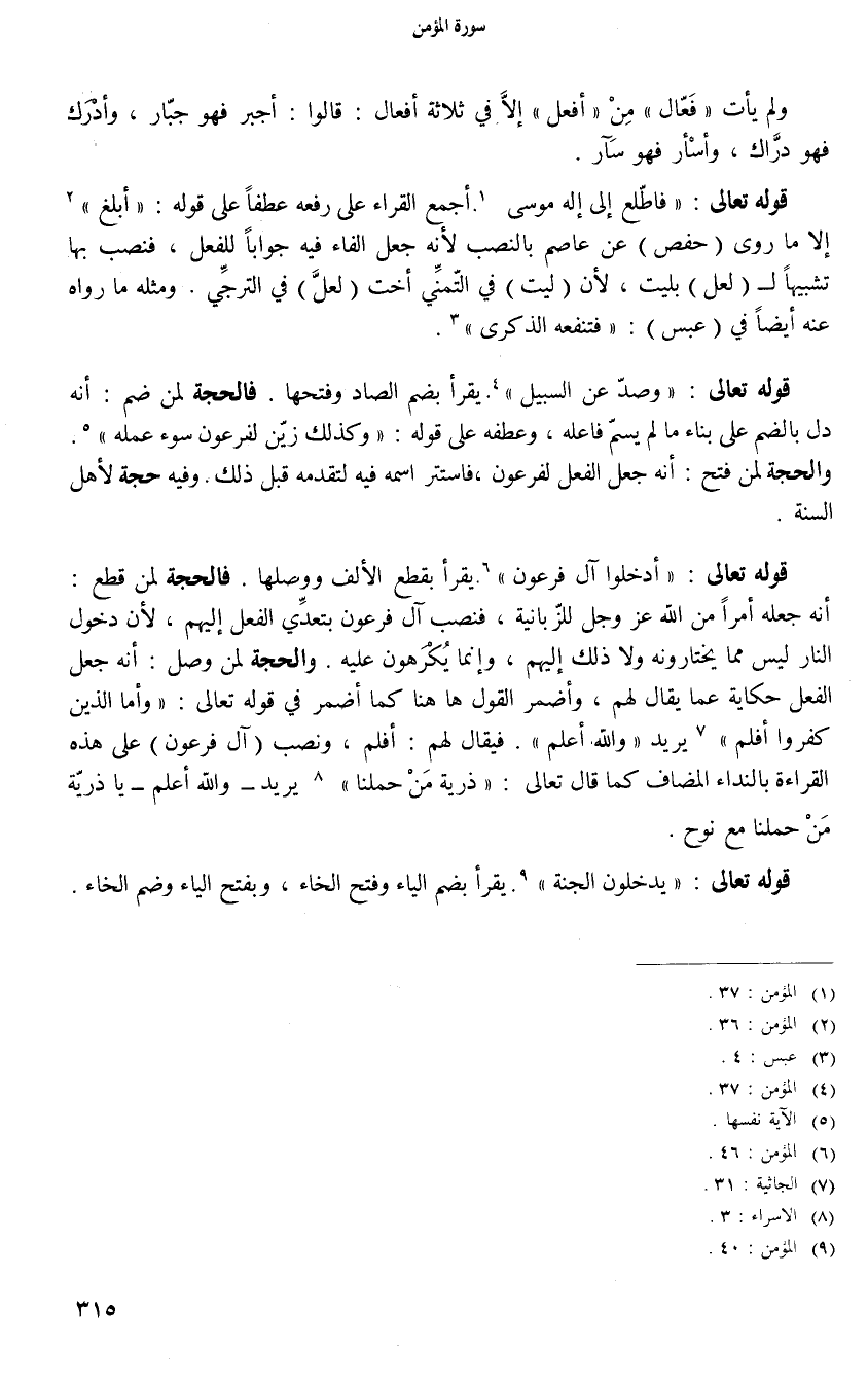 قوله تعالى: فَأَطَّلِعَ إِلى إِلهِ مُوسى «1». أجمع القراء على رفعه عطفا على قوله: أَبْلُغُ «2» إلا ما روى (حفص) عن عاصم بالنصب لأنه جعل الفاء فيه جوابا للفعل، فنصب بها تشبيها ل (لعل) بليت، لأن (ليت) في التّمنّي أخت (لعلّ) في الترجّي. ومثله ما رواه عنه أيضا في (عبس): فَتَنْفَعَهُ الذِّكْرى «3».