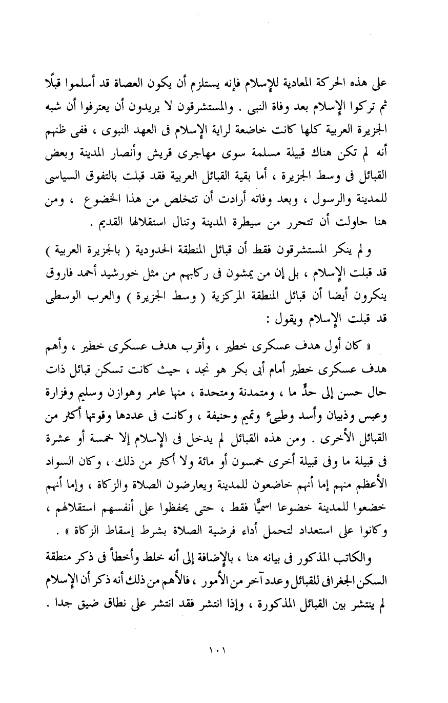 ولم ينكر المستشرقون فقط أن قبائل المنطقة الحدودية (بالجزيرة العربية) قد قبلت الإِسلام، بل إن من يمشون في ركابهم من مثل خورشيد أحمد فاروق ينكرون أيضًا أن قبائل المنطقة المركزية (وسط الجزيرة) والعرب الوسطى قد قبلت الإِسلام ويقول: