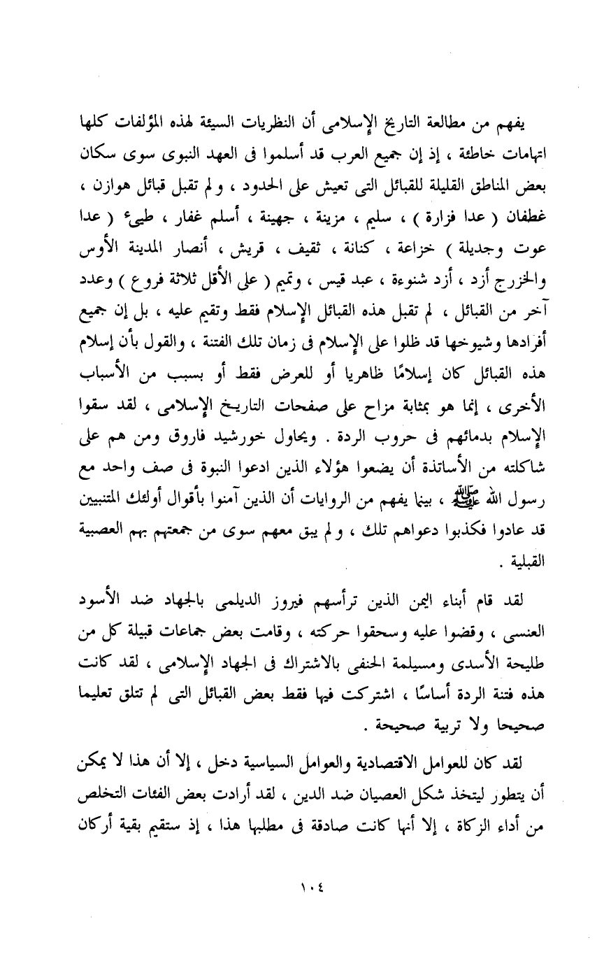 يفهم من مطالعة التاريخ الإِسلامي أن النظريات السيئة لهذه المؤلفات كلها اتهامات خاطئة، إذ إن جميع العرب قد أسلموا في العهد النبوي سوى سكان بعض المناطق القليلة للقبائل التي تعيش على الحدود، ولم تقبل قبائل هوازن، غطفان (عدا فزارة)، سليم، مزينة، جهينة، أسلم غفار، طيىء (عدا عوت وجديلة) خزاعة، كنانة، ثقيف، قريش، أنصار المدينة الأوس والخزرج أزد، أزد شنوءة، عبد قيس، وتميم (على الأقل ثلاثة فروع) وعدد آخر من القبائل، لم تقبل هذه القبائل الإسلام فقط وتقيم عليه، بل إن جميع أفرادها وشيوخها قد ظلوا على الإسلام في زمان تلك الفتنة، والقول بأن إسلام هذه القبائل كان إسلامًا ظاهريًا أو للعرض فقط أو بسبب من الأسباب الأخرى، إنما هو بمثابة مزاح على صفحات التاريخ الإسلامي، لقد سقوا الإسلام بدمائهم في حروب الردة. ويحاول خورشيد فاروق ومن هم على شاكلته من الأساتذة أن يضعوا هؤلاء الذين ادعوا النبوة في صف واحد مع رسول الله صلى الله عليه وسلم، بينما يفهم من الروايات أن الذين آمنوا بأقوال أولئك المتنبيين قد عادوا فكذبوا دعواهم تلك، ولم يبق معهم سوى من جمعتهم بهم العصبية القبلية.