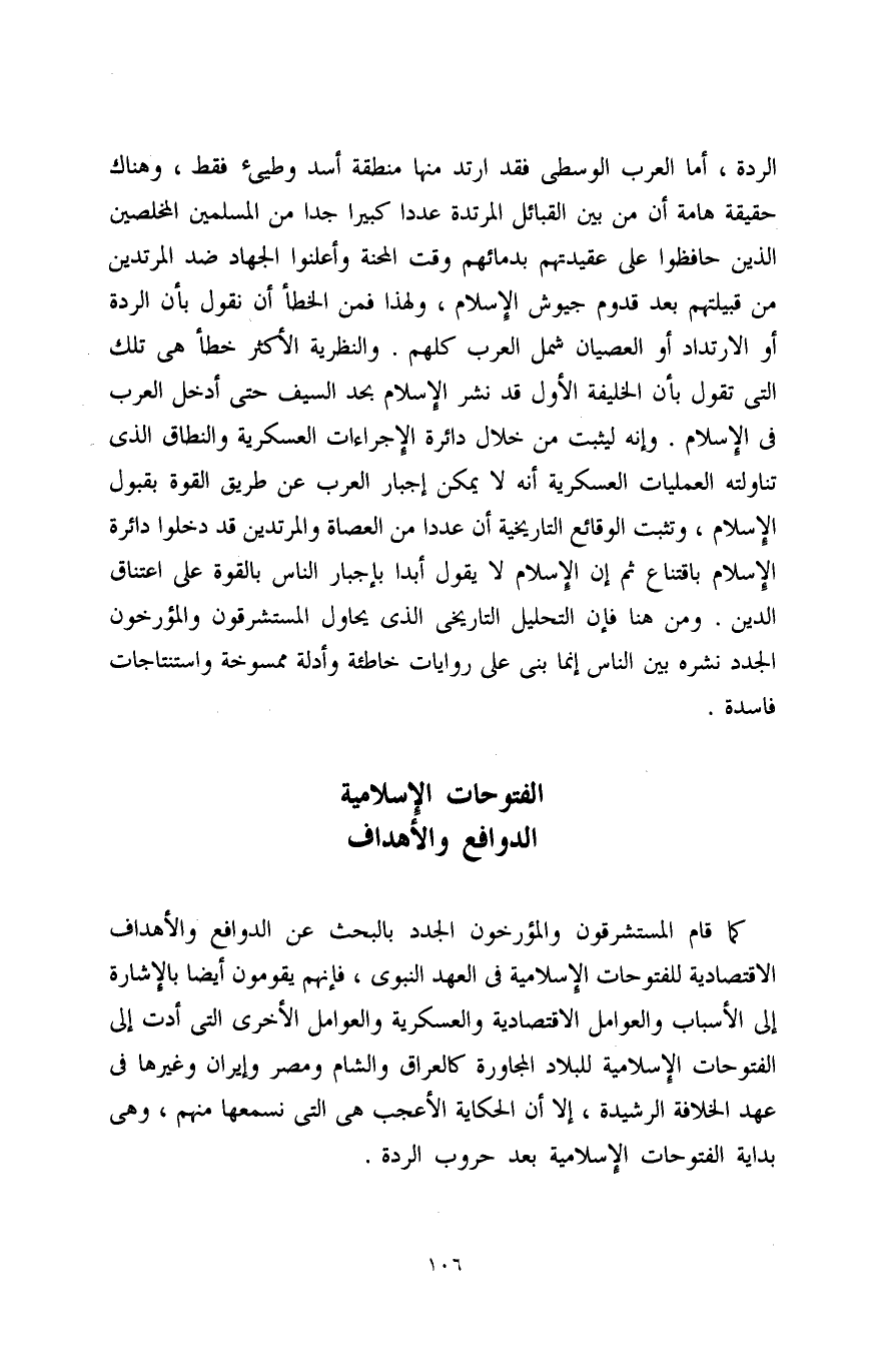 الردة، أما العرب الوسطى فقد ارتد منها منطقة أسد وطيىء فقط، وهناك حقيقة هامة أن من بين القبائل المرتدة عددًا كبيرًا جدًا من المسلمين المخلصين الذين حافظوا على عقيدتهم بدمائهم وقت المحنة وأعلنوا الجهاد ضد المرتدين من قبيلتهم بعد قدوم جيوش الإسلام، ولهذا فمن الخطأ أن نقول بأن الردة أو الارتداد أو العصيان شمل العرب كلهم. والنظرية الأكثر خطأ هي تلك التي تقول بأن الخليفة الأول قد نشر الإسلام بحد السيف حتى أدخل العرب في الإسلام. وإنه ليثبت من خلال دائرة الإجراءات العسكرية والنطاق الذي تناولته العمليات العسكرية أنه لا يمكن إجبار العرب عن طريق القوة بقبول الإسلام، وتثبت الوقائع التاريخية أن عددًا من العصاة والمرتدين قد دخلوا دائرة الإسلام باقتناع ثم إن الإسلام لا يقول أبدًا بإجبار الناس بالقوة على اعتناق الدين. ومن هنا فإن التحليل التاريخي الذي يحاول المستشرقون والمؤرخون الجدد نشره بين الناس إنما بني على روايات خاطئة وأدلة ممسوخة واستنتاجات فاسدة.