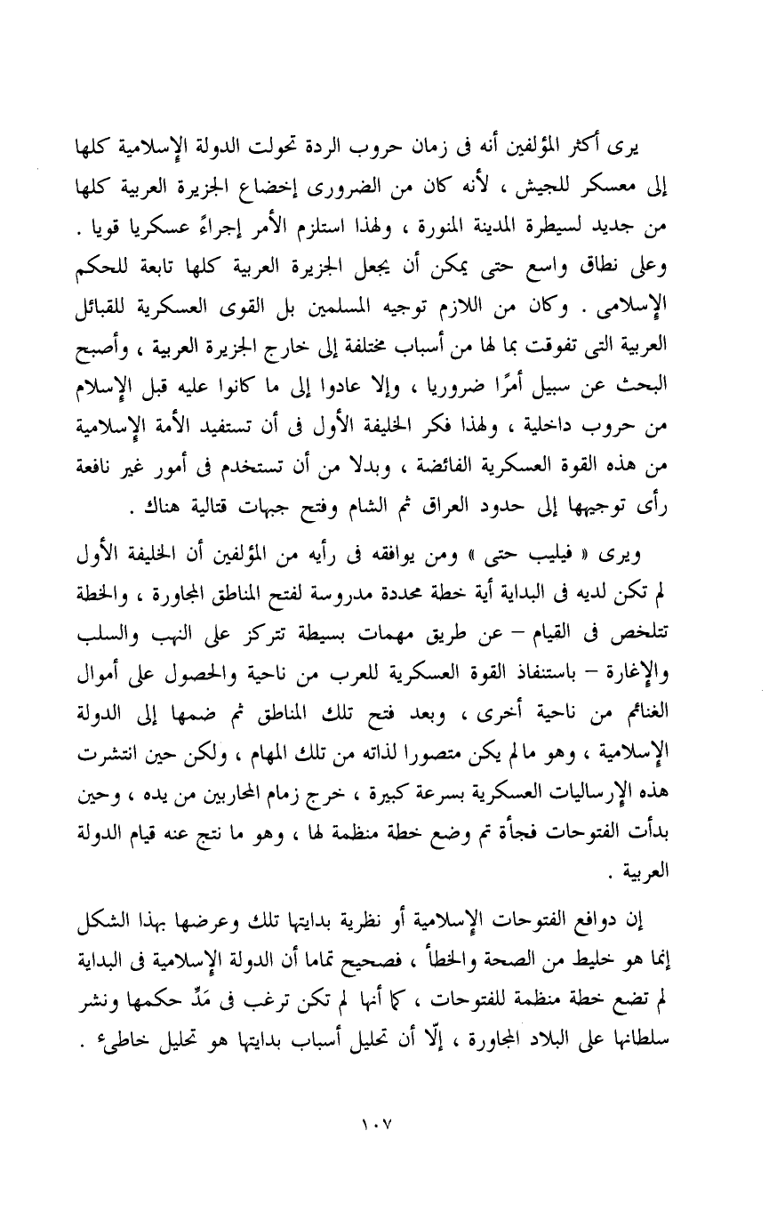 ويرى " فيليب حتى " ومن يوافقه في رأيه من المؤلفين أن الخليفة الأول لم تكن لديه في البداية أية خطة محددة مدروسة لفتح المناطق المجاورة، والخطة تتلخص في القيام -عن طريق مهمات بسيطة تتركز على النهب والسلب والاغارة- باستنفاذ القوة العسكرية للعرب من ناحية والحصول على أموال الغنائم من ناحية أخرى، وبعد فتح تلك المناطق ثم ضمها إلى الدولة الإسلامية، وهو ما لم يكن متصورًا لذاته من تلك المهام، ولكن حين انتشرت هذه الارساليات العسكرية بسرعة كبيرة، خرج زمام المحاربين من يده، وحين بدأت الفتوحات فجأة تم وضع خطة منظمة لها، وهو ما نتج عنه قيام الدولة العربية.