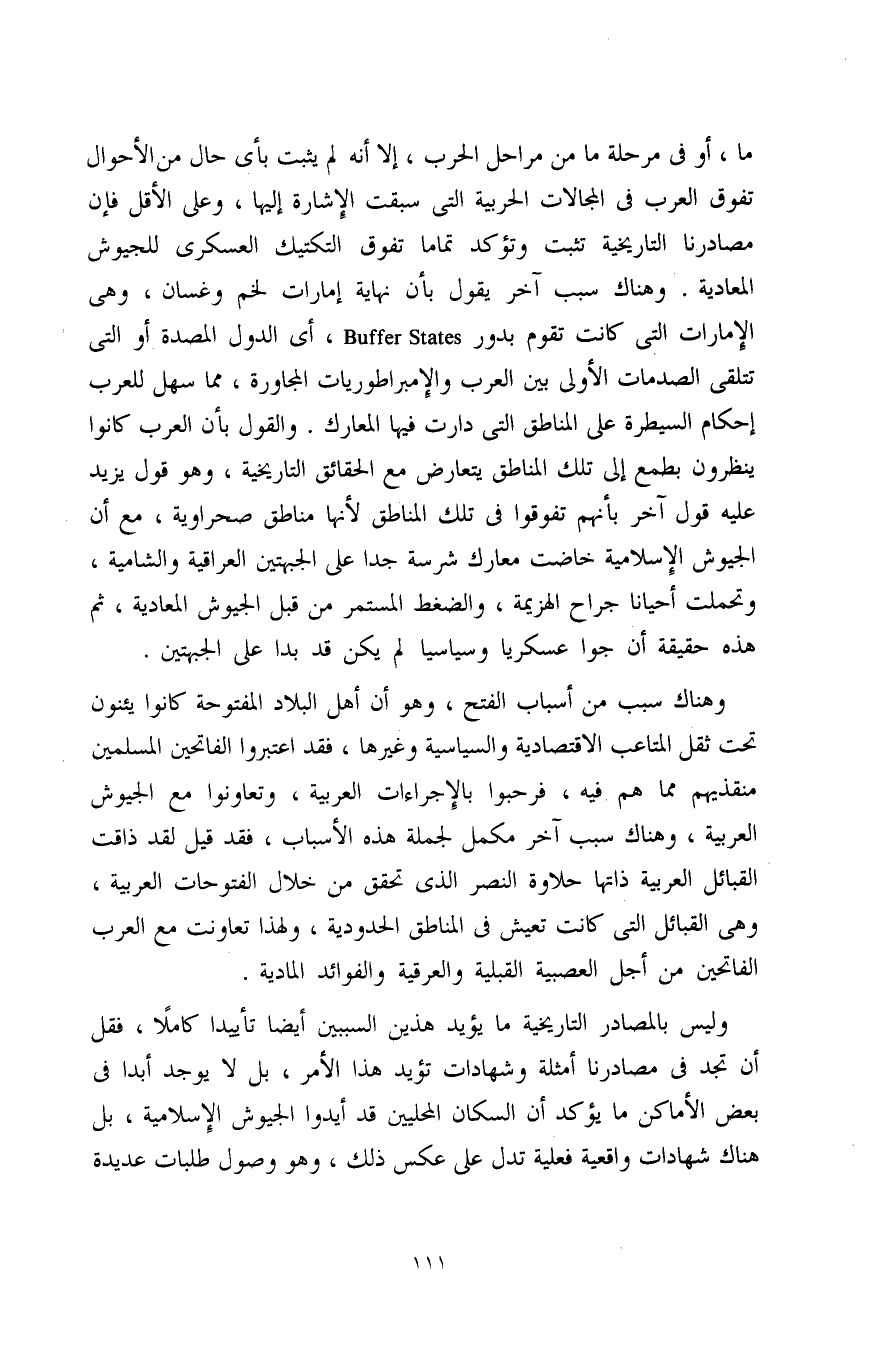 ما، أو في مرحلة ما من مراحل الحرب، إلا أنه لم يثبت بأي حال من الأحوال تفوق العرب في المجالات الحربية التي سبقت الإِشارة إليها، وعلى الأقل فإن مصادرنا التاريخية تثبت وتؤكد تمامًا تفوق التكتيك العسكري للجيوش المعادية. وهناك سبب آخر يقول بأن نهاية إمارات لخم وغسان، وهي الإمارات التي كانت تقوم بدور Buffer States، أي الدول المصدة أو التي تتلقى الصدمات الأولى بين العرب والإِمبراطوريات المجاورة، مما سهل للعرب إحكام السيطرة على المناطق التي دارت فيها المعارك. والقول بأن العرب كانوا ينظرون بطمع إلى تلك المناطق يتعارض مع الحقائق التاريخية، وهو قول يزيد عليه قول آخر بأنهم تفوقوا في تلك المناطق لأنها مناطق صحراوية، مع أن الجيوش الإِسلامية خاضت معارك شرسة جدًا على الجهتين العراقية والشامية، وتحملت أحيانًا جراح الهزيمة، والضغط المستمر من قبل الجيوش المعادية، ثم هذه حقيقة أن جوًا عسكريًا وسياسيًا لم يكن قد بدا على الجبهتين.