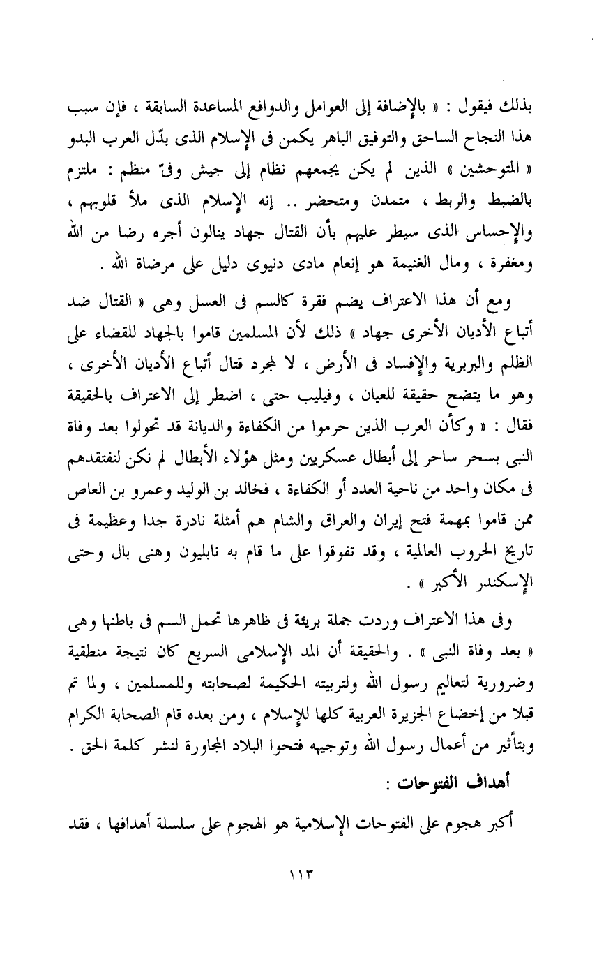 بذلك فيقول: " بالإِضافة إلى العوامل والدوافع المساعدة السابقة، فإن سبب هذا النجاح الساحق والتوفيق الباهر يكمن في الإسلام الذي بدّل العرب البدو " المتوحشين " الذين لم يكن يجمعهم نظام إلى جيش وفىّ منظم: ملتزم بالضبط والربط، متمدن ومتحضر .. إنه الإسلام الذي ملأ قلوبهم، والإحساس الذي سيطر عليهم بأن القتال جهاد ينالون أجره رضا من الله ومغفرة، ومال الغنيمة هو إنعام مادي دنيوي دليل على مرضاة الله.