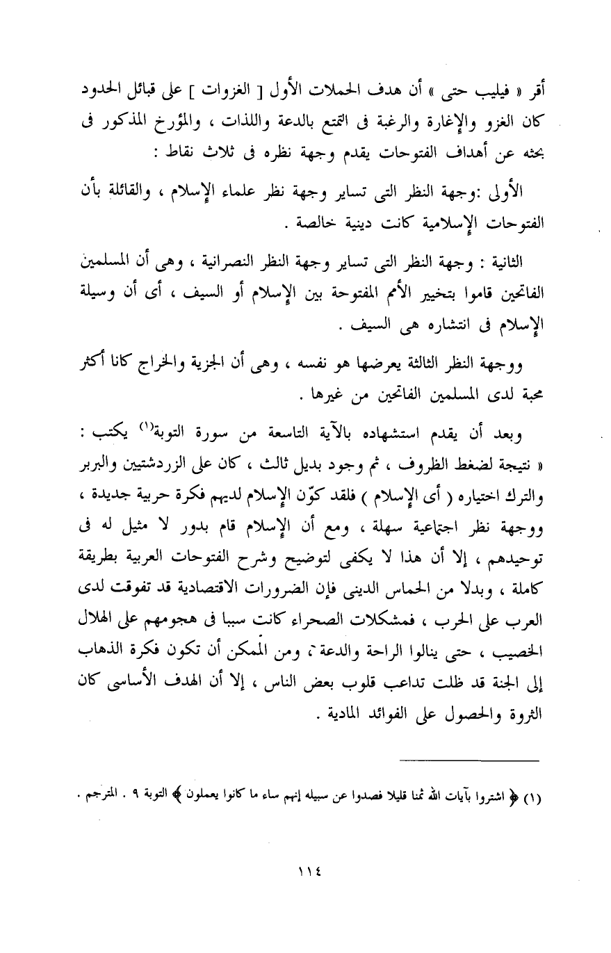 وبعد أن يقدم استشهاده بالآية التاسعة من سورة التوبة (1) يكتب: " نتيجة لضغط الظروف، ثم وجود بديل ثالث، كان على الزردشتيين والبربر والترك اختياره (أي الإسلام) فلقد كوّن الإِسلام لديهم فكرة حربية جديدة، ووجهة نظر اجتماعية سهلة، ومع أن الإِسلام قام بدور لا مثيل له في توحيدهم، إلا أن هذا لا يكفي لتوضيح وشرح الفتوحات العربية بطريقة كاملة، وبدلاً من الحماس الديني فإن الضرورات الاقتصادية قد تفوقت لدى العرب على الحرب، فمشكلات الصحراء كانت سببًا في هجومهم على الهلال الخصيب، حتى ينالوا الراحة والدعة، ومن الممكن أن تكون فكرة الذهاب إلى الجنة قد ظلت تداعب قلوب بعض الناس، إلا أن الهدف الأساسي كان الثروة والحصول على الفوائد المادية.