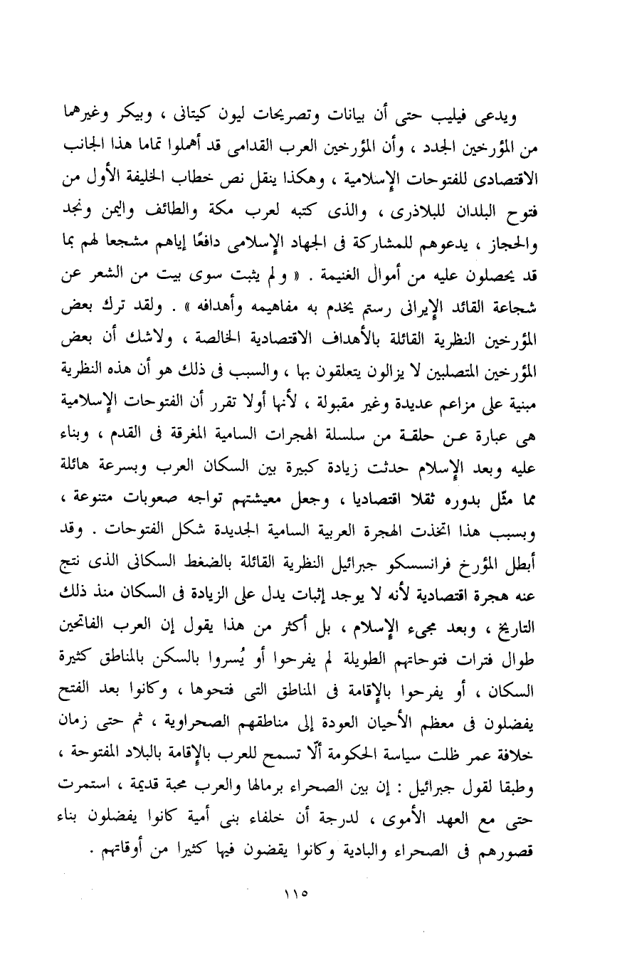 ويدعى فيليب حتى أن بيانات وتصريحات ليون كيتاني، وبيكر وغيرهما من المؤرخين الجدد، وأن المؤرخين العرب القدامى قد أهملوا تمامًا هذا الجانب الاقتصادي للفتوحات الإِسلامية، وهكذا ينقل نص خطاب الخليفة الأول من فتوح البلدان للبلاذري، والذي كتبه لعرب مكة والطائف واليمن ونجد والحجاز، يدعوهم للمشاركة في الجهاد الإسلامي دافعًا إياهم مشجعًا لهم بما قد يحصلون عليه من أموال الغنيمة. " ولم يثبت سوى بيت من الشعر عن شجاعة القائد الإيراني رستم يخدم به مفاهيمه وأهدافه ". ولقد ترك بعض المؤرخين النظرية القائلة بالأهداف الاقتصادية الخالصة، ولا شك أن بعض المؤرخين المتصلبين لا يزالون يتعلقون بها، والسبب في ذلك هو أن هذه النظرية مبنية على مزاعم عديدة وغير مقبولة، لأنها أولاً تقرر أن الفتوحات الإِسلامية هي عبارة عن حلقة من سلسلة الهجرات السامية المغرقة في القدم، وبناء عليه وبعد الإسلام حدثت زيادة كبيرة بين السكان العرب وبسرعة هائلة مما مثّل بدوره ثقلاً اقتصاديًا، وجعل معيشتهم تواجه صعوبات متنوعة، وبسبب هذا اتخذت الهجرة العربية السامية الجديدة شكل الفتوحات. وقد أبطل المؤرخ فرانسسكو جبرائيل النظرية القائلة بالضغط السكاني الذي نتج عنه هجرة اقتصادية لأنه لا يوجد إثبات يدل على الزيادة في السكان منذ ذلك التاريخ، وبعد مجىء الإسلام، بل أكثر من هذا يقول إن العرب الفاتحين طوال فترات فتوحاتهم الطويلة لم يفرحوا أو يُسروا بالسكن بالمناطق كثيرة السكان، أو يفرحوا بالإِقامة في المناطق التي فتحوها، وكانوا بعد الفتح يفضلون في معظم الأحيان العودة إلى مناطقهم الصحراوية، ثم حتى زمان خلافة عمر ظلت سياسة الحكومة ألاّ تسمح للعرب بالإِقامة بالبلاد المفتوحة، وطبقًا لقول جبرائيل: إن بين الصحراء برمالها والعرب محبة قديمة، استمرت حتى مع العهد الأموي، لدرجة أن خلفاء بني أمية كانوا يفضلون بناء قصورهم في الصحراء والبادية وكانوا يقضون فيها كثيرًا من أوقاتهم.