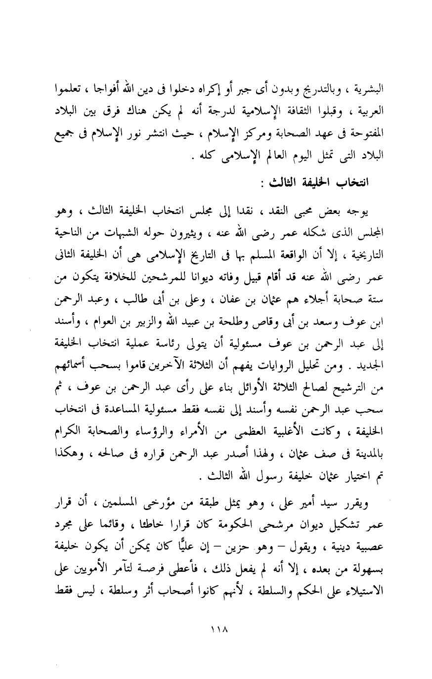 يوجه بعض محبي النقد، نقدًا إلى مجلس انتخاب الخليفة الثالث، وهو المجلس الذي شكله عمر رضي الله عنه، ويثيرون حوله الشبهات من الناحية التاريخية، إلا أن الواقعة المسلم بها في التاريخ الإِسلامي هي أن الخليفة الثاني عمر رضي الله عنه قد أقام قبيل وفاته ديوانًا للمرشحين للخلافة يتكون من ستة صحابة أجلاء هم عثمان بن عفان، وعلي بن أبي طالب، وعبد الرحمن ابن عوف وسعد بن أبي وقاص وطلحة بن عبيد الله والزبير بن العوام، وأسند إلى عبد الرحمن بن عوف مسئولية أن يتولى رئاسة عملية انتخاب الخليفة الجديد. ومن تحليل الروايات يفهم أن الثلاثة الآخرين قاموا بسحب أسمائهم من الترشيح لصالح الثلاثة الأوائل بناء على رأي عبد الرحمن بن عوف، ثم سحب عبد الرحمن نفسه وأسند إلى نفسه فقط مسئولية المساعدة في انتخاب الخليفة، وكانت الأغلبية العظمى من الأمراء والرؤساء والصحابة الكرام بالمدينة في صف عثمان، ولهذا أصدر عبد الرحمن قراره في صالحه، وهكذا تم اختيار عثمان خليفة رسول الله الثالث.