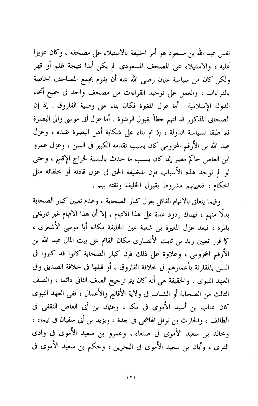 نفس عبد الله بن مسعود هو أمر الخليفة بالاستيلاء على مصحفه، وكان عزيزًا عليه، والاستيلاء على المصحف المسعودي لم يكن أبدًا نتيجة ظلم أو قهر ولكن كان من سياسة عثمان رضي الله عنه أن يقوم بجمع المصاحف الخاصة بالقراءات، والعمل على توحيد القراءات من مصحف واحد في جميع أنحاء الدولة الإِسلامية. أما عزل المغيرة فكان بناء على وصية الفاروق. إذ إن الصحابي المذكور قد اتهم خطأ بقبول الرشوة. أما عزل أبي موسى والي البصرة فتم طبقًا لسياسة الدولة، إذ تم بناء على شكاية أهل البصرة ضده، وعزل عبد الله بن الأرقم المخزومي كان بسبب تقدمه الكبير في السن، وعزل عمرو ابن العاص حاكم مصر إنما كان بسبب ما حدث بالنسبة لخراج الإِقليم، وحتى لو لم توجد هذه الأسباب فإن للخليفة الحق في عزل قادته أو خلفائه مثل الحكام، فتعيينهم مشروط بقبول الخليفة وثقته بهم.