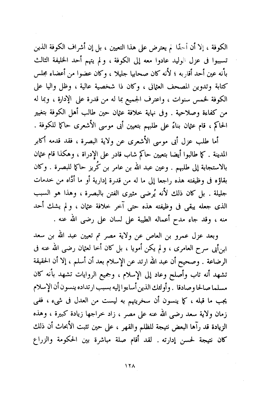 الكوفة، إلا أن أحدًا لم يعترض على هذا التعيين، بل إن أشراف الكوفة الذين تسببوا في عزل الوليد عادوا معه إلى الكوفة، ولم يتهم أحد الخليفة الثالث بأنه عين أحد أقاربه؛ لأنه كان صحابيًا جليلاً، وكان عضوًا من أعضاء مجلس كتابة وتدوين المصحف العثماني، وكان ذا شخصية عالية، وظل واليًا على الكوفة لخمس سنوات، واعترف الجميع بما له من قدرة على الإدارة، وبما له من كفاءة وصلاحية. وفي نهاية خلافة عثمان حين طالب أهل الكوفة بتغيير الحاكم، قام عثمان بناءً على طلبهم بتعيين أبي موسى الأشعرى حاكمًا للكوفة.