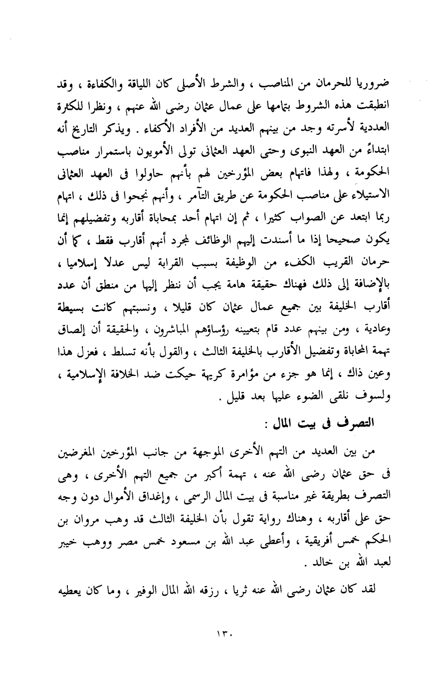 ضروريًا للحرمان من المناصب، والشرط الأصلي كان اللياقة والكفاءة، وقد انطبقت هذه الشروط بتمامها على عمال عثمان رضي الله عنهم، ونظرًا للكثرة العددية لأسرته وجد من بينهم العديد من الأفراد الأكفاء. ويذكر التاريخ أنه ابتداءً من العهد النبوي وحتى العهد العثماني تولى الأمويون باستمرار مناصب الحكومة، ولهذا فاتهام بعض المؤرخين لهم بأنهم حاولوا في العهد العثماني الاستيلاء على مناصب الحكومة عن طريق التآمر، وأنهم نجحوا في ذلك، اتهام ربما ابتعد عن الصواب كثيرًا، ثم إن اتهام أحد بمحاباة أقاربه وتفضيلهم إنما يكون صحيحًا إذا ما أسندت إليهم الوظائف لمجرد أنهم أقارب فقط، كما أن حرمان القريب الكُفء من الوظيفة بسبب القرابة ليس عدلاً إسلاميًا، بالإضافة إلى ذلك فهناك حقيقة هامة يجب أن ننظر إليها من منطق أن عدد أقارب الخليفة بين جميع عمال عثمان كان قليلاً، ونسبتهم كانت بسيطة وعادية، ومن بينهم عدد قام بتعيينه رؤساؤهم المباشرون، والحقيقة أن إلصاق تهمة المحاباة وتفضيل الأقارب بالخليفة الثالث، والقول بأنه تسلط، فعزل هذا وعين ذاك، إنما هو جزء من مؤامرة كريهة حيكت ضد الخلافة الإسلامية، ولسوف نلقي الضوء عليها بعد قليل.