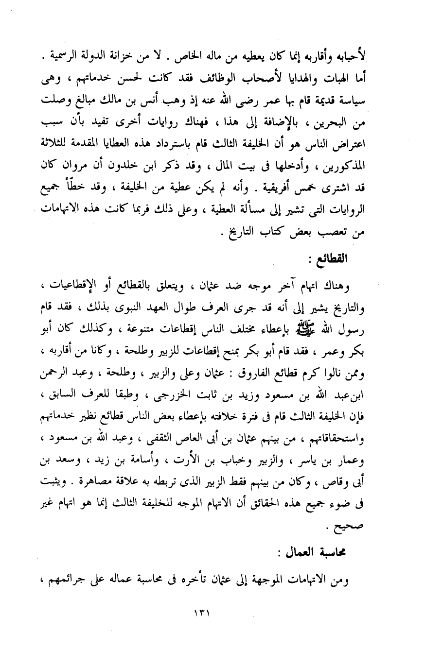 وهناك اتهام آخر موجه ضد عثمان، ويتعلق بالقطائع أو الإقطاعيات، والتاريخ يشير إلى أنه قد جرى العرف طوال العهد النبوي بذلك، فقد قام رسول الله صلى الله عليه وسلم بإعطاء مختلف الناس إقطاعات متنوعة، وكذلك كان أبو بكر وعمر، فقد قام أبو بكر بمنح إقطاعات للزبير وطلحة، وكانا من أقاربه، وممن نالوا كرم قطائع الفاروق: عثمان وعلي والزبير، وطلحة، وعبد الرحمن ابن عبد الله بن مسعود وزيد بن ثابت الخزرجي، وطبقًا للعرف السابق، فإن الخليفة الثالث قام في فترة خلافته بإعطاء بعض الناس قطائع نظير خدماتهم واستحقاقاتهم، من بينهم عثمان بن أبي العاص الثقفي، وعبد الله بن مسعود، وعمار بن ياسر، والزبير وخباب بن الأرت، وأسامة بن زيد، وسعد بن أبي وقاص، وكان من بينهم فقط الزبير الذي تربطه به علاقة مصاهرة. ويثبت في ضوء جميع هذه الحقائق أن الاتهام الموجه للخليفة الثالث إنما هو اتهام غير صحيح.