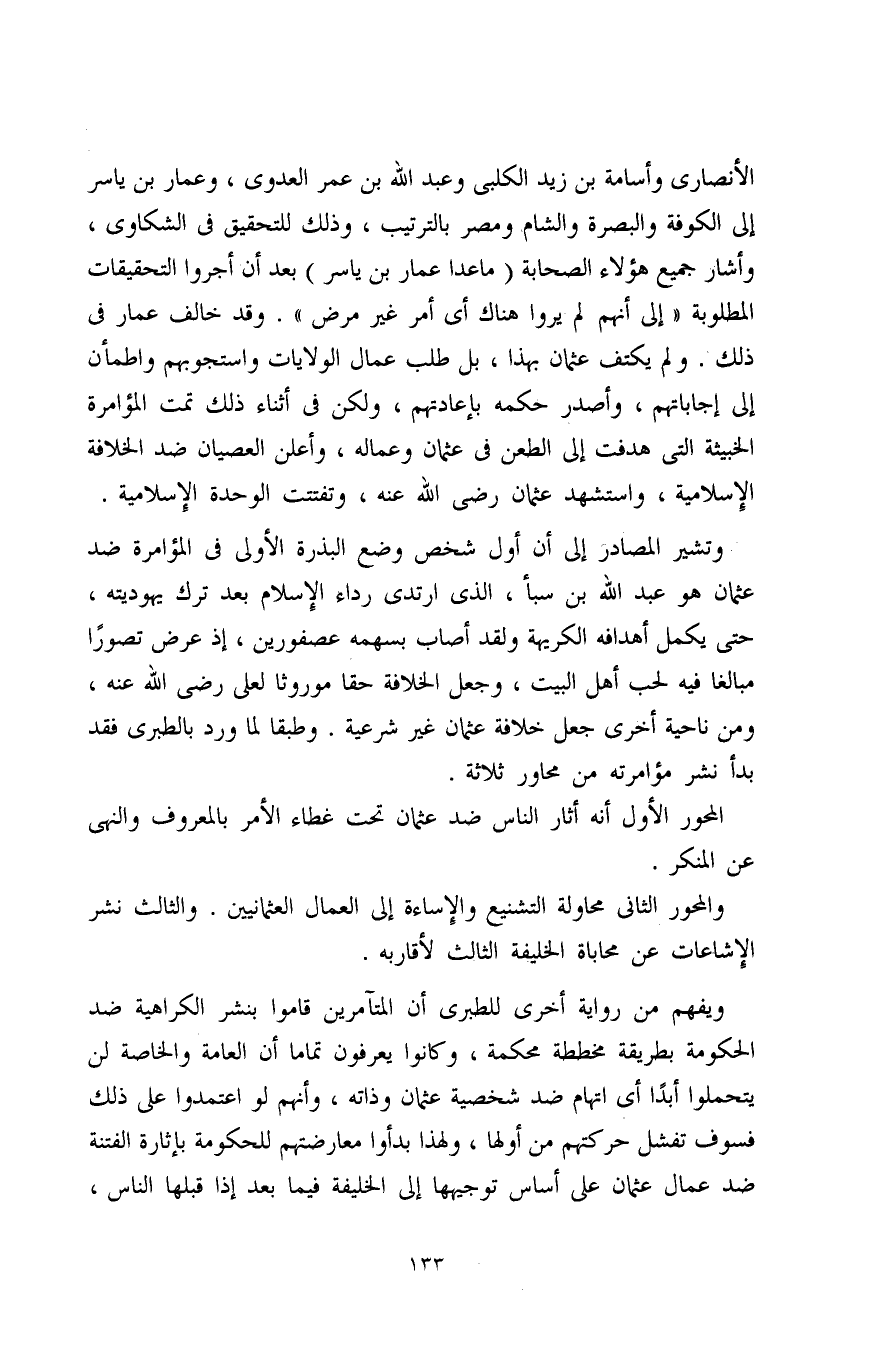 الأنصاري وأسامة بن زيد الكلبي وعبد الله بن عمر العدوي، وعمار بن ياسر إلى الكوفة والبصرة والشام، ومصر بالترتيب، وذلك للتحقيق في الشكاوى، وأشار جميع هؤلاء الصحابة (ما عدا عمار بن ياسر) بعد أن أجروا التحقيقات المطلوبة " إلى أنهم لم يروا هناك أي أمر غير مرض ". وقد خالف عمار في ذلك. ولم يكتف عثمان بهذا، بل طلب عمال الولايات واستجوبهم واطمأن إلى إجاباتهم، وأصدر حكمه بإعادتهم، ولكن في أثناء ذلك تمت المؤامرة الخبيثة التي هدفت إلى الطعن في عثمان وعماله، وأعلن العصيان ضد الخلافة الإسلامية، واستشهد عثمان رضي الله عنه، وتفتتت الوحدة الإِسلامية.