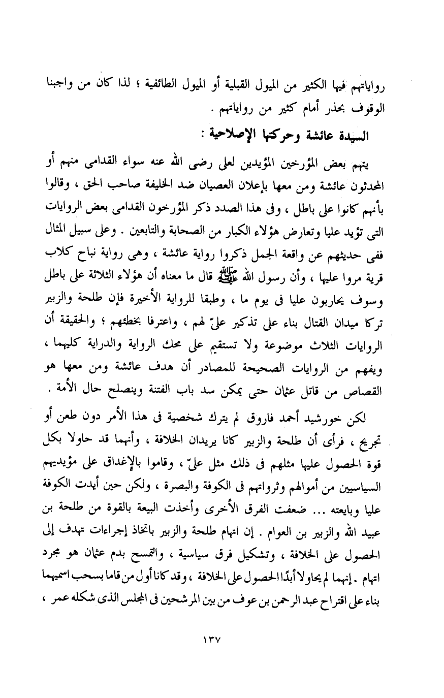 لكن خورشيد أحمد فاروق لم يترك شخصية في هذا الأمر دون طعن أو تجريح، فرأى أن طلحة والزبير كانا يريدان الخلافة، وأنهما قد حاولا بكل قوة الحصول عليها مثلهم في ذلك مثل علىّ، وقاموا بالإغداق على مؤيديهم السياسيين من أموالهم وثرواتهم في الكوفة والبصرة، ولكن حين أيدت الكوفة عليا وبايعته ... ضعفت الفرق الأخرى وأخذت البيعة بالقوة من طلحة بن عبيد الله والزبير بن العوام. إن اتهام طلحة والزبير باتخاذ إجراءات تهدف إلى الحصول على الخلافة، وتشكيل فرق سياسية، والتمسح بدم عثمان هو مجرد اتهام. إنهما لم يحاولا أبدًا الحصول على الخلافة، وقد كانا أول من قاما بسحب اسميهما بناء على اقتراح عبد الرحمن بن عوف من بين المرشحين في المجلس الذي شكله عمر،