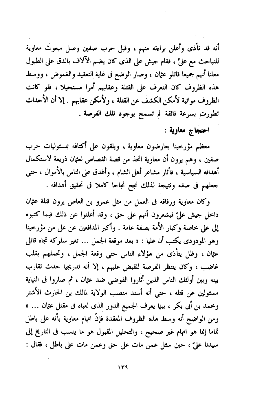 أنه قد تأذى وأعلن براءته منهم، وقبل حرب صفين وصل مبعوث معاوية للتباحث مع عليٍّ، فقام جيش علي الذي كان يضم الآلاف بالدق على الطبول معلنا أنهم جميعًا قاتلو عثمان، وصار الوضع في غاية التعقيد والغموض، ووسط هذه الظروف كان التعرف على القتلة وعقابهم أمرًا مستحيلاً، فلو كانت الظروف مواتية لأمكن الكشف عن القتلة، ولأمكن عقابهم. إلا أن الأحداث تطورت بسرعة فائقة لم تسمح بوجود تلك الفرصة.