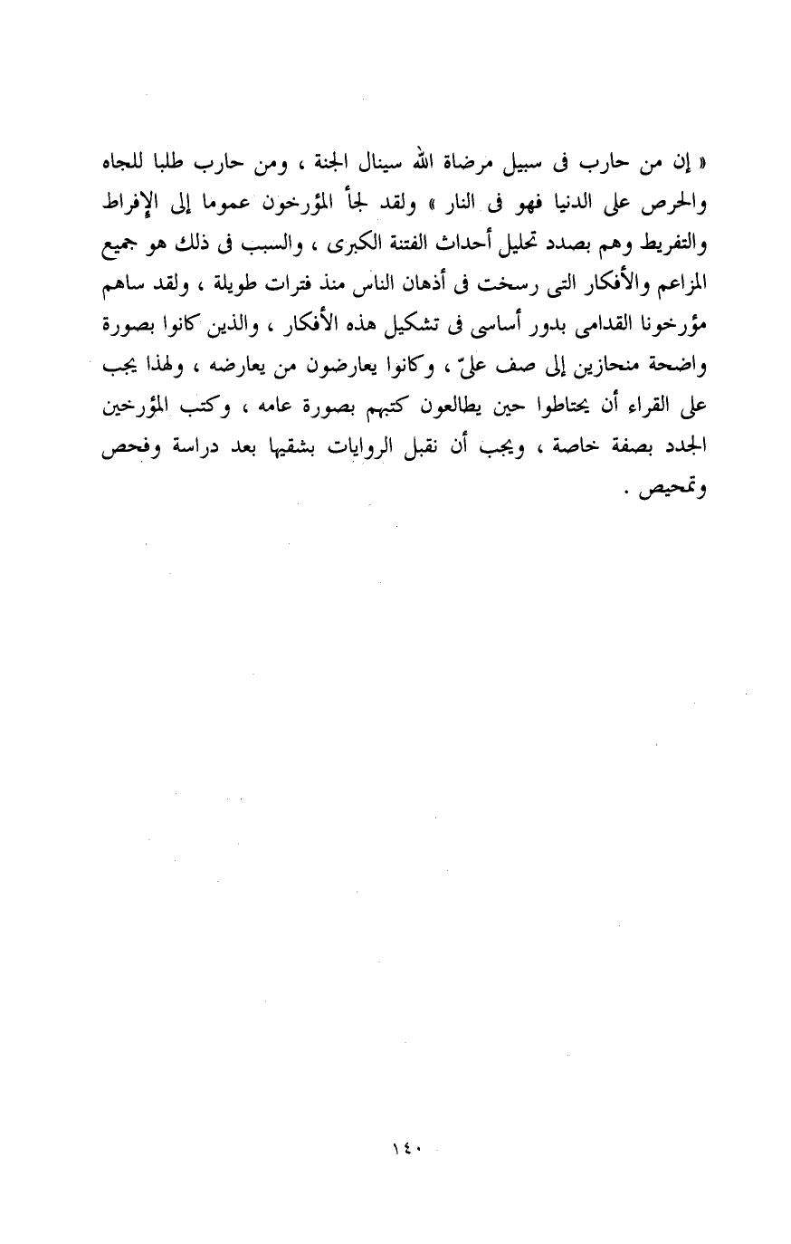 " إن من حارب في سبيل مرضاة الله سينال الجنة، ومن حارب طلبًا للجاه والحرص على الدنيا فهو في النار " ولقد لجأ المؤرخون عمومًا إلى الإفراط والتفريط وهم بصدد تحليل أحداث الفتنة الكبرى، والسبب في ذلك هو جميع المزاعم والأفكار التي رسخت في أذهان الناس منذ فترات طويلة، ولقد ساهم مؤرخونا القدامى بدور أساسي في تشكيل هذه الأفكار، والذين كانوا بصورة واضحة منحازين إلى صف عليّ، وكانوا يعارضون من يعارضه، ولهذا يجب على القراء أن يحتاطوا حين يطالعون كتبهم بصورة عامة، وكتب المؤرخين الجدد بصفة خاصة، ويجب أن نقبل الروايات بشقيها بعد دراسة وفحص وتمحيص.