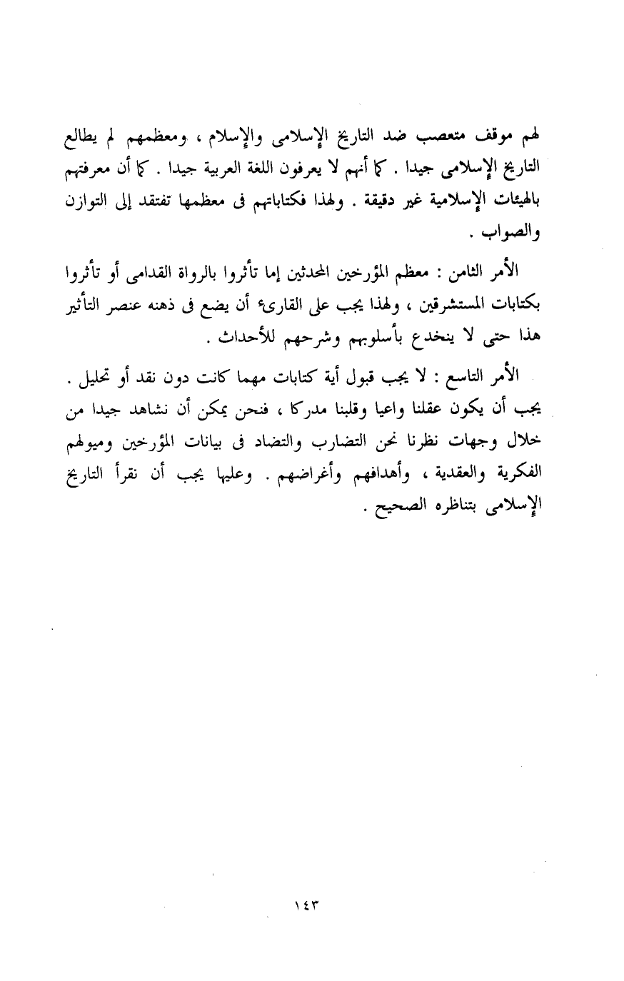 الأمر الثامن: معظم المؤرخين المحدثين إما تأثروا بالرواة القدامى أو تأثروا بكتابات المستشرقين، ولهذا يجب على القارىء أن يضع في ذهنه عنصر التأثير هذا حتى لا ينخدع بأسلوبهم وشرحهم للأحداث.