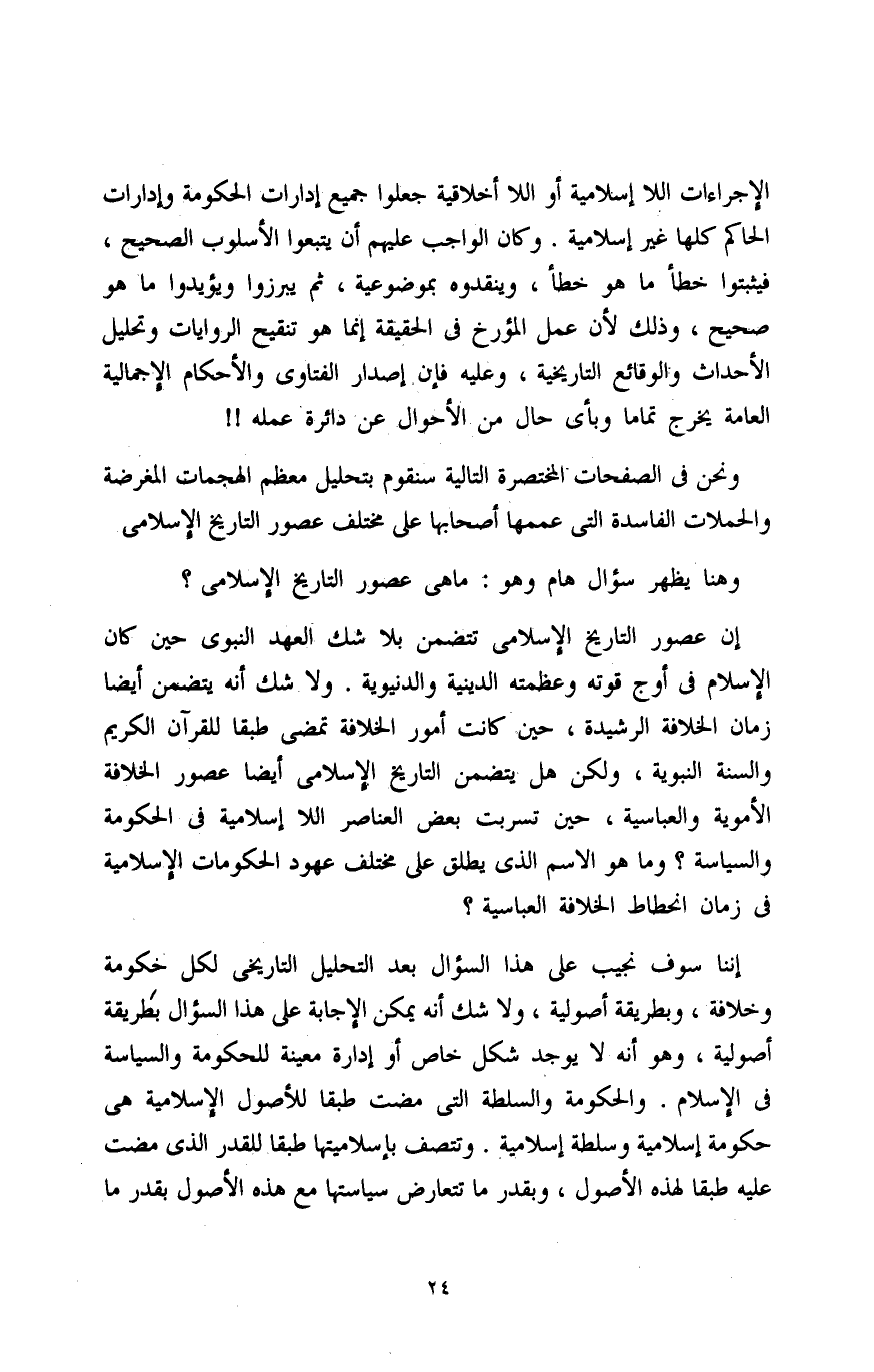الإجراءات اللا إسلامية أو اللا أخلاقية جعلوا جميع إدارات الحكومة وإدارات الحاكم كلها غير إسلامية. وكان الواجب عليهم أن يتبعوا الأسلوب الصحيح، فيثبتوا خطأ ما هو خطأ، وينقدوه بموضوعية، ثم يبرزوا ويؤيدوا ما هو صحيح، وذلك لأن عمل المؤرخ في الحقيقة إنما هو تنقيح الروايات وتحليل الأحداث والوقائع التاريخية، وعليه فإن إصدار الفتاوى والأحكام الإجمالية العامة يخرج تمامًا وبأي حال من الأحوال عن دائرة عمله!!