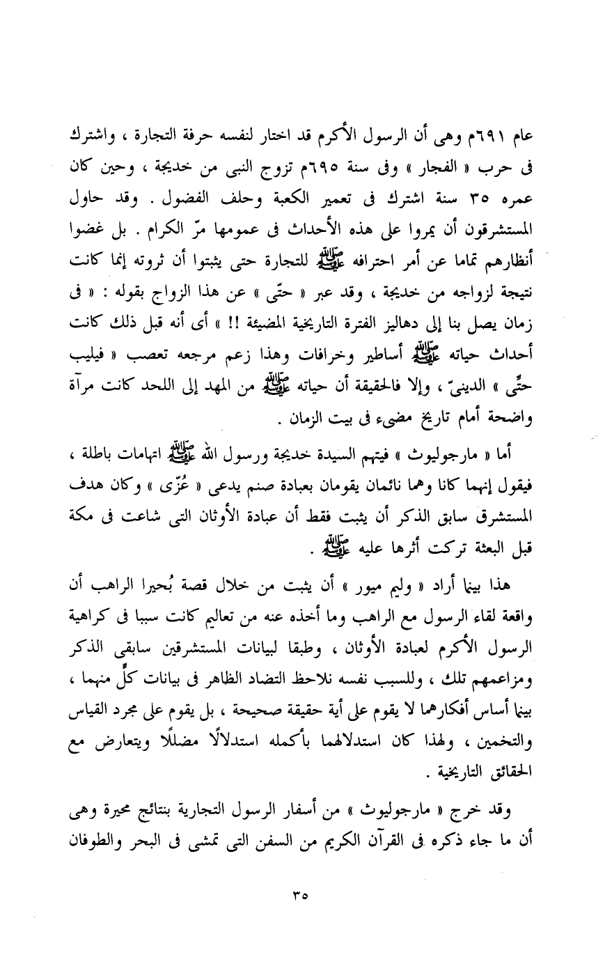 عام 691 م وهي أن الرسول الأكرم قد اختار لنفسه حرفة التجارة، واشترك في حرب " الفجار " وفي سنة 695 م تزوج النبي من خديجة، وحين كان عمره 35 سنة اشترك في تعمير الكعبة وحلف الفضول. وقد حاول المستشرقون أن يمروا على هذه الأحداث في عمومها مرّ الكرام. بل غضوا أنظارهم تمامًا عن أمر احترافه صلى الله عليه وسلم للتجارة حتى يثبتوا أن ثروته إنما كانت نتيجة لزواجه من خديجة، وقد عبر " حتّى " عن هذا الزواج بقوله: " في زمان يصل بنا إلى دهاليز الفترة التاريخية المضيئة!! " أي أنه قبل ذلك كانت أحداث حياته صلى الله عليه وسلم أساطير وخرافات وهذا زعم مرجعه تعصب " فيليب حتِّى " الدينىّ، وإلا فالحقيقة أن حياته صلى الله عليه وسلم من المهد إلى اللحد كانت مرآة واضحة أمام تاريخ مضىء في بيت الزمان.