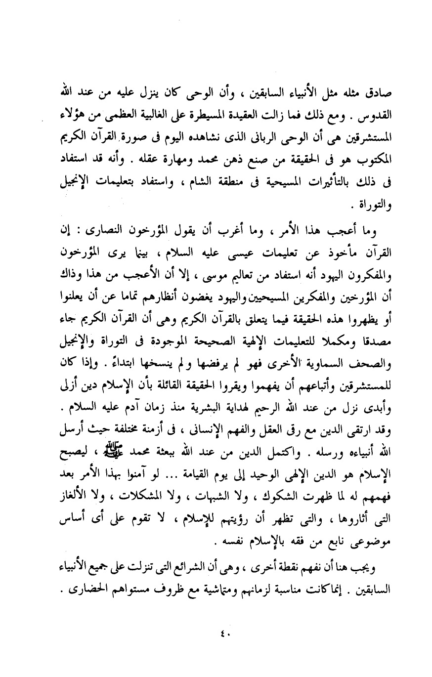 وقد ارتقى الدين مع رقي العقل والفهم الإنساني، في أزمنة مختلفة حيث أرسل الله أنبياءه ورسله. واكتمل الدين من عند الله ببعثة محمد صلى الله عليه وسلم، ليصبح الإسلام هو الدين الإلهي الوحيد إلى يوم القيامة ... لو آمنوا بهذا الأمر بعد فهمهم له لما ظهرت الشكوك، ولا الشبهات، ولا المشكلات، ولا الألغاز التي أثاروها، والتي تظهر أن رؤيتهم للإسلام، لا تقوم على أي أساس موضوعى نابع من فقه بالإسلام نفسه.