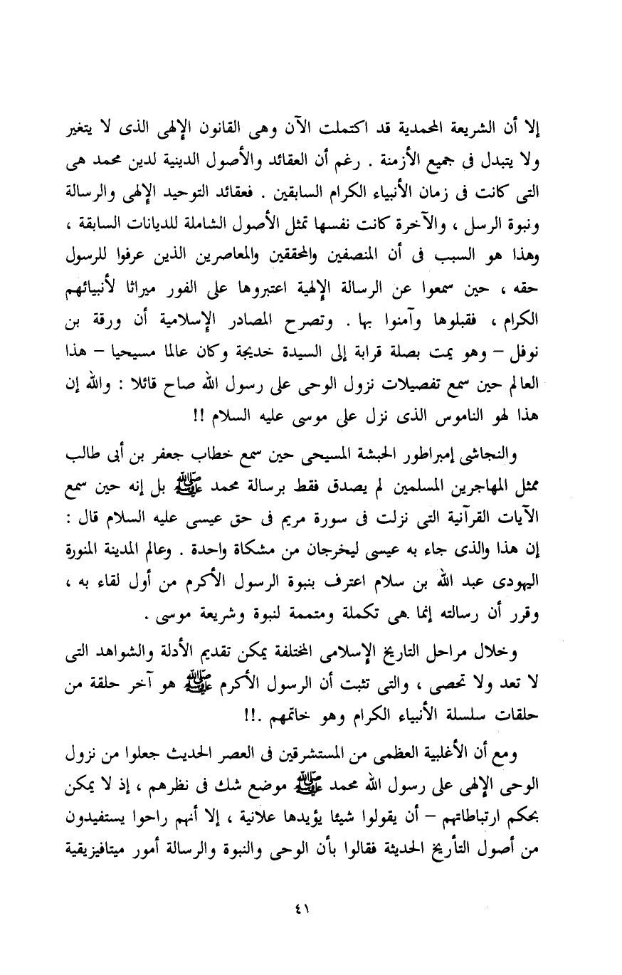 إلا أن الشريعة المحمدية قد اكتملت الآن وهي القانون الإلهي الذي لا يتغير ولا يتبدل في جميع الأزمنة. رغم أن العقائد والأصول الدينية لدين محمد هي التي كانت في زمان الأنبياء الكرام السابقين. فعقائد التوحيد الإلهي والرسالة ونبوة الرسل، والآخرة كانت نفسها تمثل الأصول الشاملة للديانات السابقة، وهذا هو السبب في أن المنصفين والمحققين والمعاصرين الذين عرفوا للرسول حقه، حين سمعوا عن الرسالة الإلهية اعتبروها على الفور ميراثًا لأنبيائهم الكرام، فقبلوها وآمنوا بها. وتصرح المصادر الإسلامية أن ورقة بن نوفل -وهو يمت بصلة قرابة إلى السيدة خديجة وكان عالمًا مسيحيًا- هذا العالم حين سمع تفصيلات نزول الوحي على رسول الله صاح قائلاً: والله إن هذا لهو الناموس الذي نزل على موسى عليه السلام!!