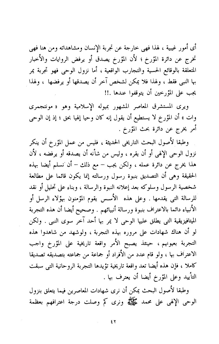 أي أمور غيبية، لهذا فهي خارجة عن تجربة الإنسان ومشاهداته ومن هنا فهي تخرج عن دائرة المؤرخ؛ لأن المؤرخ يصدق أو يرفض الروايات والأخبار المتعلقة بالوقائع الحسية والتجارب الواقعية، أما نزول الوحي فهو تجربة يمر بها النبي فقط، ولهذا فلا يمكن لشخص آخر أن يصدقها أو يرفضها، ولهذا يجب على المؤرخين أن يتوقفوا عندها.!!
