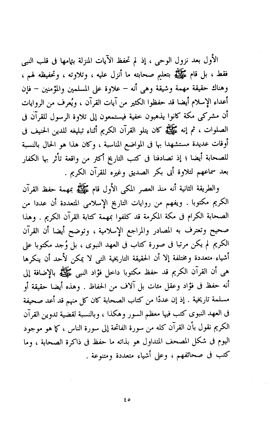 والطريقة الثانية أنه منذ العصر المكي الأول قام صلى الله عليه وسلم بمهمة حفظ القرآن الكريم مكتوبًا. ويفهم من روايات التاريخ الإسلامي المتعددة أن عددًا من الصحابة الكرام في مكة المكرمة قد كلفوا بمهمة كتابة القرآن الكريم. وهذا صحيح وتعترف به المصادر والمراجع الإسلامية، وتوضح أيضًا أن القرآن الكريم لم يكن مرتبًا في صورة كتاب في العهد النبوي، بل وُجد مكتوبًا على أشياء. متعددة ومختلفة إلا أن الحقيقة التاريخية التي لا يمكن لأحد أن ينكرها هي أن القرآن الكريم قد حفظ مكتوبًا داخل فؤاد النبي صلى الله عليه وسلم بالإضافة إلى أنه حفظ في فؤاد وعقل مئات بل آلاف من الحفاظ. وهذه أيضًا حقيقة أو مسلمة تاريخية. إذ إن عددًا من كتاب الصحابة كان كل منهم قد أعد صحيفة في العهد النبوي كتب فيها معظم السور وهكذا، وبالنسبة لقضية تدوين القرآن الكريم نقول بأن القرآن كله من سورة الفاتحة إلى سورة الناس، كما هو موجود اليوم في شكل المصحف المتداول هو بذاته ما حفظ في ذاكرة الصحابة، وما كتب في صحائفهم، وعلى أشياء متعددة ومتنوعة.
