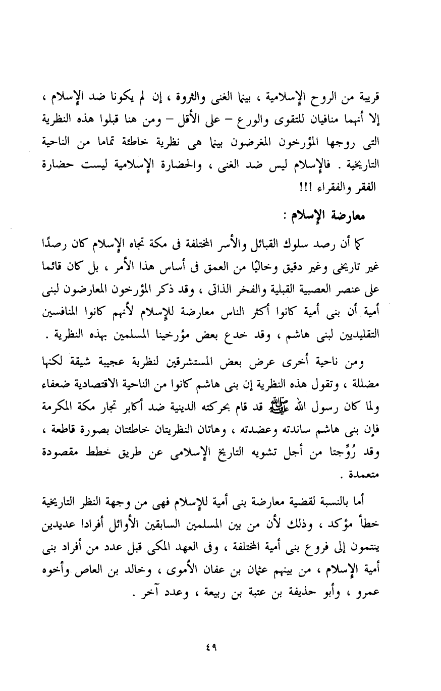 كما أن رصد سلوك القبائل والأسر المختلفة في مكة تجاه الإسلام كان رصدًا غير تاريخي وغير دقيق وخاليًا من العمق في أساس هذا الأمر، بل كان قائمًا على عنصر العصبية القبلية والفخر الذاتي، وقد ذكر المؤرخون المعارضون لبني أمية أن بني أمية كانوا أكثر الناس معارضة للإِسلام لأنهم كانوا المنافسين التقليديين لبني هاشم، وقد خدع بعض مؤرخينا المسلمين بهذه النظرية.