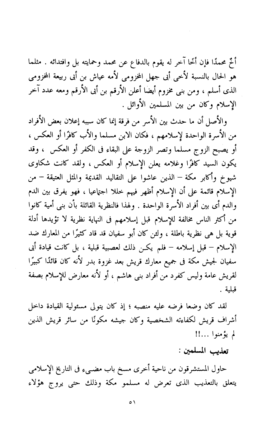 والأصل أن ما حدث بين الأسر من فرقة إنما كان سببه إعلان بعض الأفراد من الأسرة الواحدة لإِسلامهم، فكان الابن مسلما والأب كافرًا أو العكس، أو يصبح الزوج مسلمًا وتصر الزوجة على البقاء في الكفر أو العكس، وقد يكون السيد كافرًا وغلامه يعلن الإِسلام أو العكس، ولقد كانت شكاوى شيوخ وأكابر مكة -الذين عاشوا على التقاليد القديمة والمثل العتيقة- من الإسلام قائمة على أن الإسلام أظهر فيهم خللاً اجتماعيًا، فهو يفرق بين الدم والدم أي بين أفراد الأسرة الواحدة. ولهذا فالنظرية القائلة بأن بني أمية كانوا من أكثر الناس مخالفة للإِسلام قبل إسلامهم في النهاية نظرية لا تؤيدها أدلة قوية بل هي نظرية باطلة، ولئن كان أبو سفيان قد قاد كثيرًا من المعارك ضد الإِسلام -قبل إسلامه- فلم يكن ذلك لعصبية قبلية، بل كانت قيادة أبي سفيان لجيش مكة في جميع معارك قريش بعد غزوة بدر لأنه كان قائدًا كبيرًا لقريش عامة وليس كفرد من أفراد بني أمية، أو لأنه معارض للإِسلام بصفة قبلية.