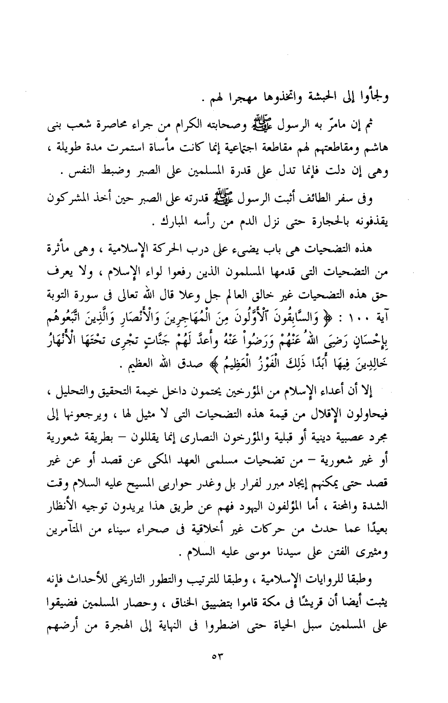 إلا أن أعداء الإِسلام من المؤرخين يحتمون داخل خيمة التحقيق والتحليل، فيحاولون الإقلال من قيمة هذه التضحيات التي لا مثيل لها، ويرجعونها إلى مجرد عصبية دينية أو قبلية والمؤرخون النصارى إنما يقللون -بطريقة شعورية أو غير شعورية- من تضحيات مسلمى العهد المكي عن قصد أو عن غير قصد حتى يمكنهم إيجاد مبرر لفرار بل وغدر حواريي المسيح عليه السلام وقت الشدة والمحنة، أما المؤلفون اليهود فهم عن طريق هذا يريدون توجيه الأنظار بعيدًا عما حدث من حركات غير أخلاقية في صحراء سيناء من المتآمرين ومثيري الفتن على سيدنا موسى عليه السلام.
