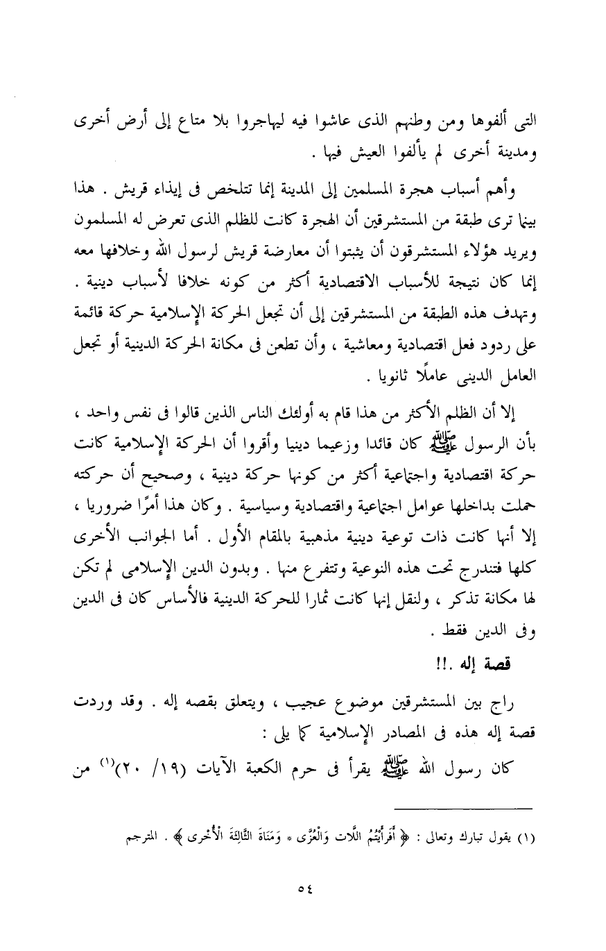 إلا أن الظلم الأكثر من هذا قام به أولئك الناس الذين قالوا في نفس واحد، بأن الرسول صلى الله عليه وسلم كان قائدًا وزعيمًا دينيًا وأقروا أن الحركة الإِسلامية كانت حركة اقتصادية واجتماعية أكثر من كونها حركة دينية، وصحيح أن حركته حملت بداخلها عوامل اجتماعية واقتصادية وسياسية. وكان هذا أمرًا ضروريًا، إلا أنها كانت ذات توعية دينية مذهبية بالمقام الأول. أما الجوانب الأخرى كلها فتندرج تحت هذه النوعية وتتفرع منها. وبدون الدين الإِسلامي لم تكن لها مكانة تذكر، ولنقل إنها كانت ثمارًا للحركة الدينية فالأساس كان في الدين وفي الدين فقط.