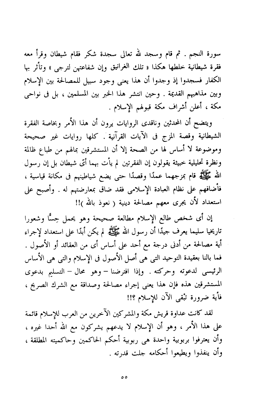 سورة النجم. ثم قام وسجد لله تعالى سجدة شكر فقام شيطان وقرأ معه فقرة شيطانية خلطها هكذا " تلك الغرانيق وإن شفاعتهن لترجى " وتأثر بها الكفار فسجدوا إذ وجدوا أن هذا يعني وجود سبيل للمصالحة بين الإِسلام وبين مذاهبهم القديمة. وحين انتشر هذا الخبر بين المسلمين، بل في نواحي مكة، أعلن أشراف مكة قبولهم الإِسلام.