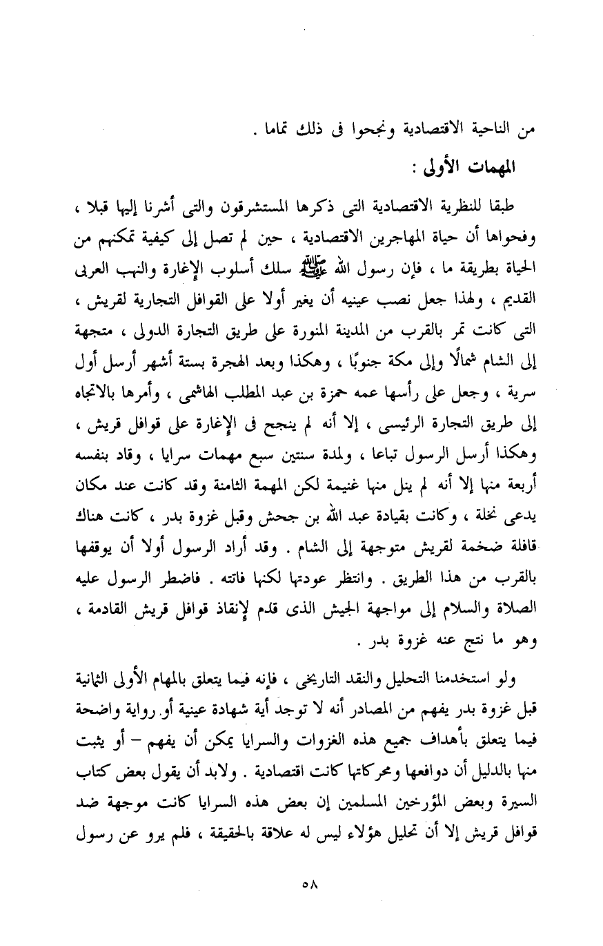 ولو استخدمنا التحليل والنقد التاريخي، فإنه فيما يتعلق بالمهام الأولى الثمانية قبل غزوة بدر يفهم من المصادر أنه لا توجد أية شهادة عينية أو رواية واضحة فيما يتعلق بأهداف جميع هذه الغزوات والسرايا يمكن أن يفهم - أو يثبت منها بالدليل أن دوافعها ومحركاتها كانت اقتصادية. ولابد أن يقول بعض كتاب السيرة وبعض المؤرخين المسلمين إن بعض هذه السرايا كانت موجهة ضد قوافل قريش إلا أن تحليل هؤلاء ليس له علاقة بالحقيقة، فلم يرو عن رسول