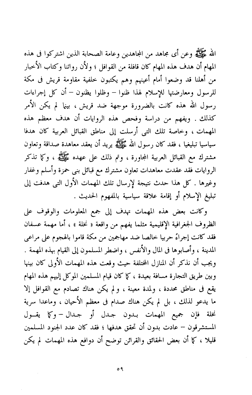 الله صلى الله عليه وسلم وعن أي مجاهد من المجاهدين وعامة الصحابة الذين اشتركوا في هذه المهام أن هدف هذه المهام كان قافلة من القوافل، ولأن رواتنا وكتاب الأخبار من أهلنا قد وضعوا أمام أعينهم وهم يكتبون خلفية مقاومة قريش في مكة للرسول ومعارضتها للإِسلام لهذا ظنوا -وظلوا يظنون- أن كل إجراءات رسول الله هذه كانت بالضرورة موجهة ضد قريش، بينما لم يكن الأمر كذلك. ويفهم من دراسة وفحص هذه الروايات أن هدف معظم هذه المهمات، وخاصة تلك التي أرسلت إلى مناطق القبائل العربية كان هدفًا سياسيًا تبليغيًا، فقد كان رسول الله صلى الله عليه وسلم يريد أن يعقد معاهدة صداقة وتعاون مشترك مع القبائل العربية المجاورة، وتم ذلك على عهده صلى الله عليه سلم، وكما تذكر الروايات فقد عقدت معاهدات تعاون مشترك مع قبائل بني حمزة وأسلم وغفار وغيرها. كل هذا حدث نتيجة لإِرسال تلك المهمات الأول التي هدفت إلى تبليغ الإِسلام أو إقامة علاقة سياسية بالمفهوم الحديث.