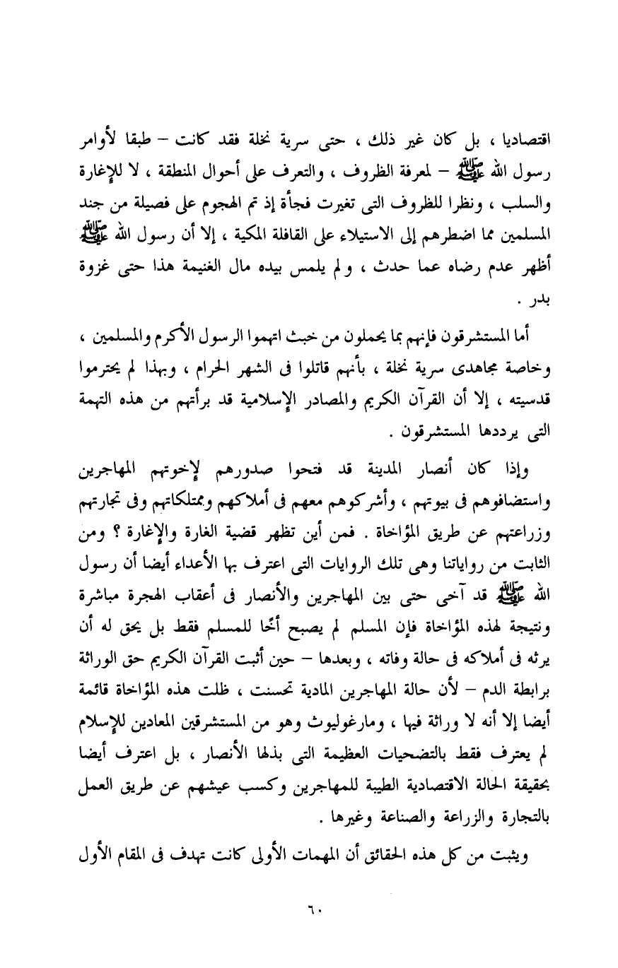 اقتصاديًا، بل كان غير ذلك، حتى سرية نخلة فقد كانت - طبقًا لأوامر رسول الله صلى الله عليه وسلم - لمعرفة الظروف، والتعرف على أحوال المنطقة، لا للإغارة والسلب، ونظرًا للظروف التي تغيرت فجأة إذ تم الهجوم على فصيلة من جند المسلمين مما اضطرهم إلى الاستيلاء على القافلة المكية، إلا أن رسول الله صلى الله عليه وسلم أظهر عدم رضاه عما حدث، ولم يلمس بيده مال الغنيمة هذا حتى غزوة بدر.