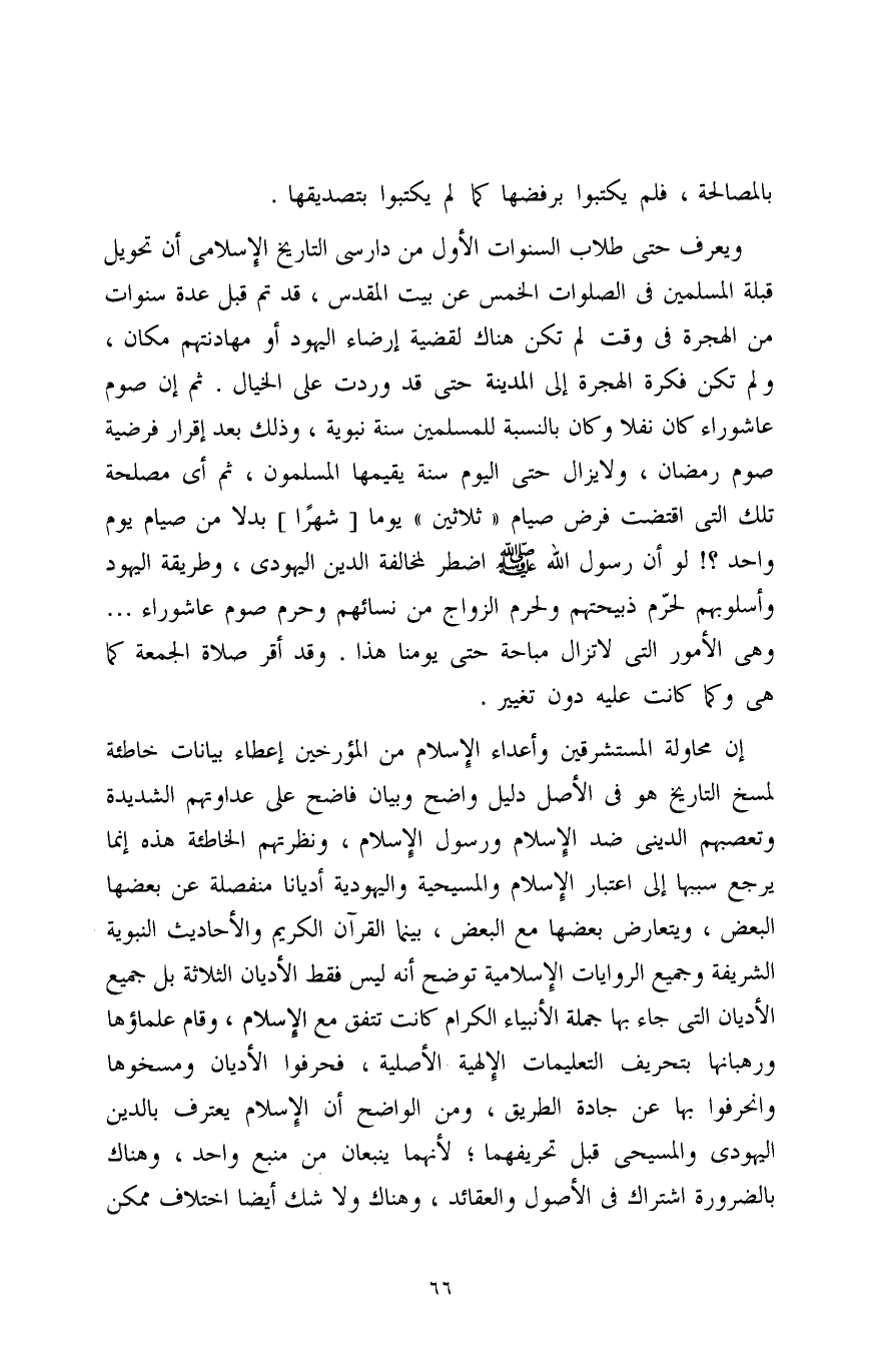 إن محاولة المستشرقين وأعداء الإِسلام من المؤرخين إعطاء بيانات خاطئة لمسخ التاريخ هو في الأصل دليل واضح وبيان فاضح على عداوتهم الشديدة وتعصبهم الديني ضد الإِسلام ورسول الإِسلام، ونظرتهم الخاطئة هذه إنما يرجع سببها إلى اعتبار الإِسلام والمسيحية واليهودية أديانًا منفصلة عن بعضها البعض، ويتعارض بعضها مع البعض، بينما القرآن الكريم والأحاديث النبوية الشريفة وجميع الروايات الإِسلامية توضح أنه ليس فقط الأديان الثلاثة بل جميع الأديان التي جاء بها جملة الأنبياء الكرام كانت تتفق مع الإسلام، وقام علماؤها ورهبانها بتحريف التعليمات الإِلهية الأصلية، فحرفوا الأديان ومسخوها وانحرفوا بها عن جادة الطريق، ومن الواضح أن الإِسلام يعترف بالدين اليهودي والمسيحى قبل تحريفهما؛ لأنهما ينبعان من منبع واحد، وهناك بالضرورة اشتراك في الأصول والعقائد، وهناك ولا شك أيضًا اختلاف ممكن