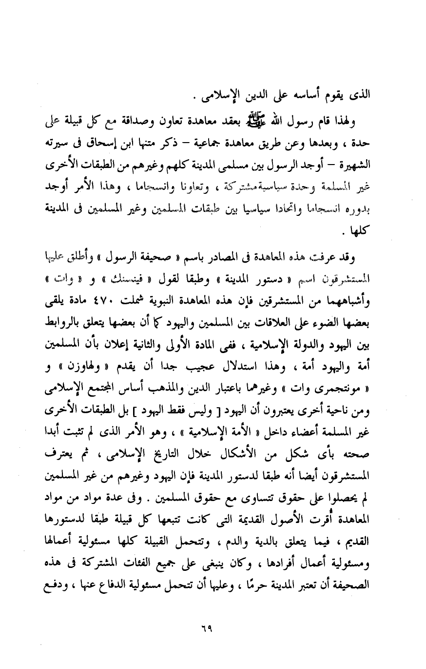 وقد عرفت هذه المعاهدة في المصادر باسم " صحيفة الرسول " وأطلق عليها المستشرقون اسم " دستور المدينة " وطبقًا لقول " فينسنك " و " وات " وأشباههما من المستشرقين فإن هذه المعاهدة النبوية شملت 470 مادة يلقي بعضها الضوء على العلاقات بين المسلمين واليهود كما أن بعضها يتعلق بالروابط بين اليهود والدولة الإسلامية، ففي المادة الأولى والثانية إعلان بأن المسلمين أمة واليهود أمة، وهذا استدلال عجيب جدًا أن يقدم " ولهاوزن " و" مونتجمري وات " وغيرهما باعتبار الدين والمذهب أساس المجتمع الإسلامي ومن ناحية أخرى يعتبرون أن اليهود [وليس فقط اليهود] بل الطبقات الأخرى غير المسلمة أعضاء داخل " الأمة الإسلامية "، وهو الأمر الذي لم تثبت أبدًا صحته بأي شكل من الأشكال خلال التاريخ الإسلامي، ثم يعترف المستشرقون أيضًا أنه طبقًا لدستور المدينة فإن اليهود وغيرهم من غير المسلمين لم يحصلوا على حقوق تتساوى مع حقوق المسلمين. وفي عدة مواد من مواد المعاهدة أُقرت الأصول القديمة التي كانت تتبعها كل قبيلة طبقًا لدستورها القديم، فيما يتعلق بالدية والدم، وتتحمل القبيلة كلها مسئولية أعمالها ومسئولية أعمال أفرادها، وكان ينبغي على جميع الفئات المشتركة في هذه الصحيفة أن تعتبر المدينة حرمًا، وعليها أن تتحمل مسئولية الدفاع عنها، ودفع