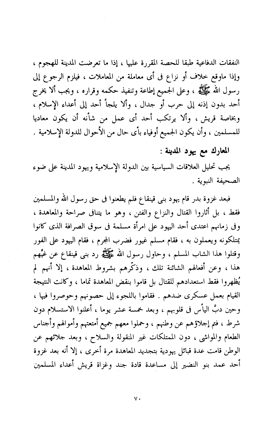 النفقات الدفاعية طبقًا للحصة المقررة عليها، إذا ما تعرضت المدينة للهجوم، وإذا ما وقع خلاف أو نزاع في أي معاملة من المعاملات، فيلزم الرجوع إلى رسول الله صلى الله عليه وسلم، وعلى الجميع إطاعة وتنفيذ حكمه وقراره، ويجب ألا يخرج أحد بدون إذنه إلى حرب أو جدال، وألا يلجأ أحد إلى أعداء الإسلام، وبخاصة قريش، وألا يرتكب أحد أي عمل من شأنه أن يكون معاديًا للمسلمين، وأن يكون الجميع أوفياء بأي حال من الأحوال للدولة الإِسلامية.