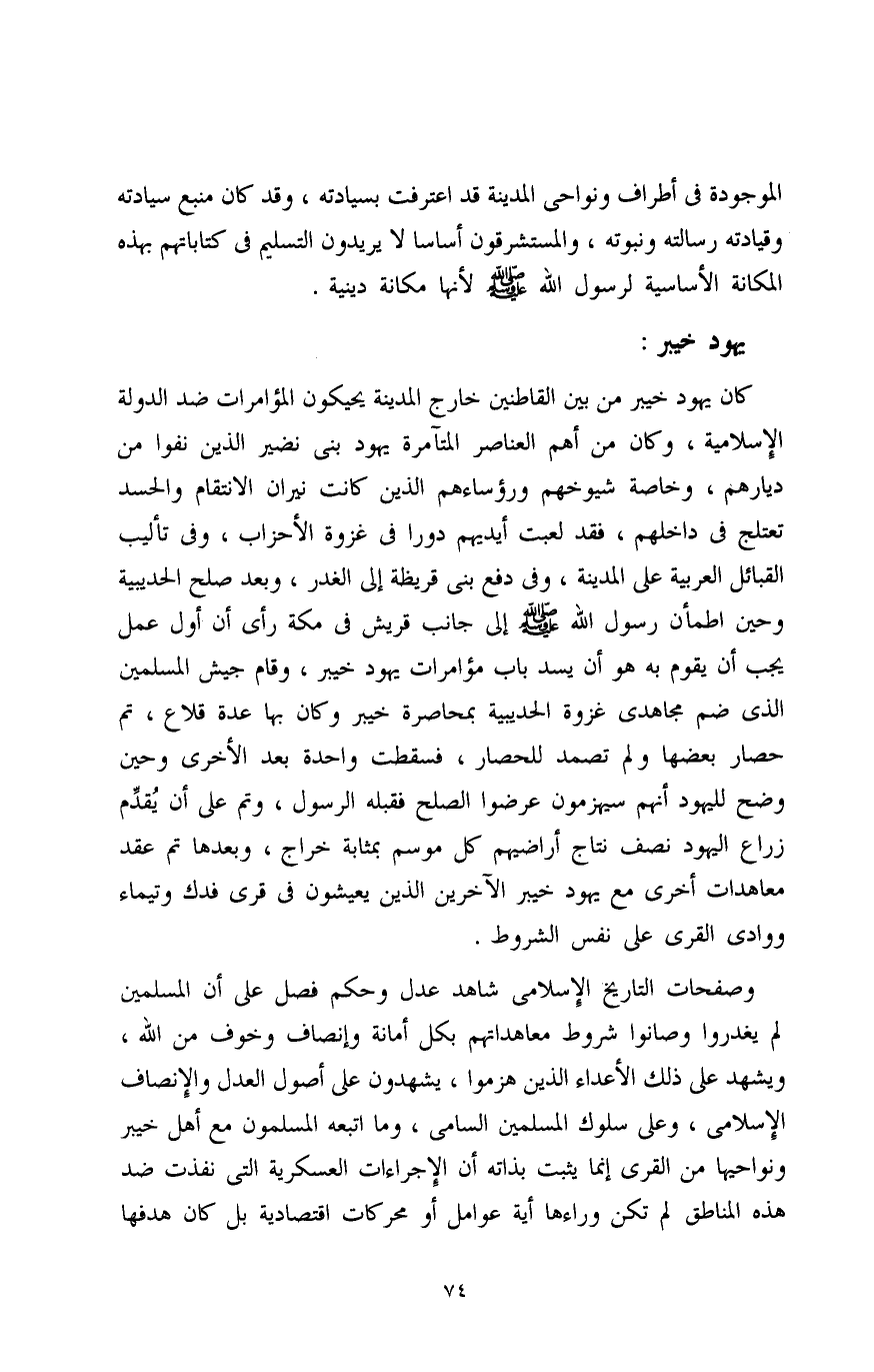 وصفحات التاريخ الإسلامي شاهد عدل وحكم فصل على أن المسلمين لم يغدروا وصانوا شروط معاهداتهم بكل أمانة وإنصاف وخوف من الله، ويشهد على ذلك الأعداء الذين هزموا، يشهدون على أصول العدل والإنصاف الإسلامي، وعلى سلوك المسلمين السامي، وما اتبعه المسلمون مع أهل خيبر ونواحيها من القرى إنما يثبت بذاته أن الإجراءات العسكرية التي نفذت ضد هذه المناطق لم تكن وراءها أية عوامل أو محركات اقتصادية بل كان هدفها