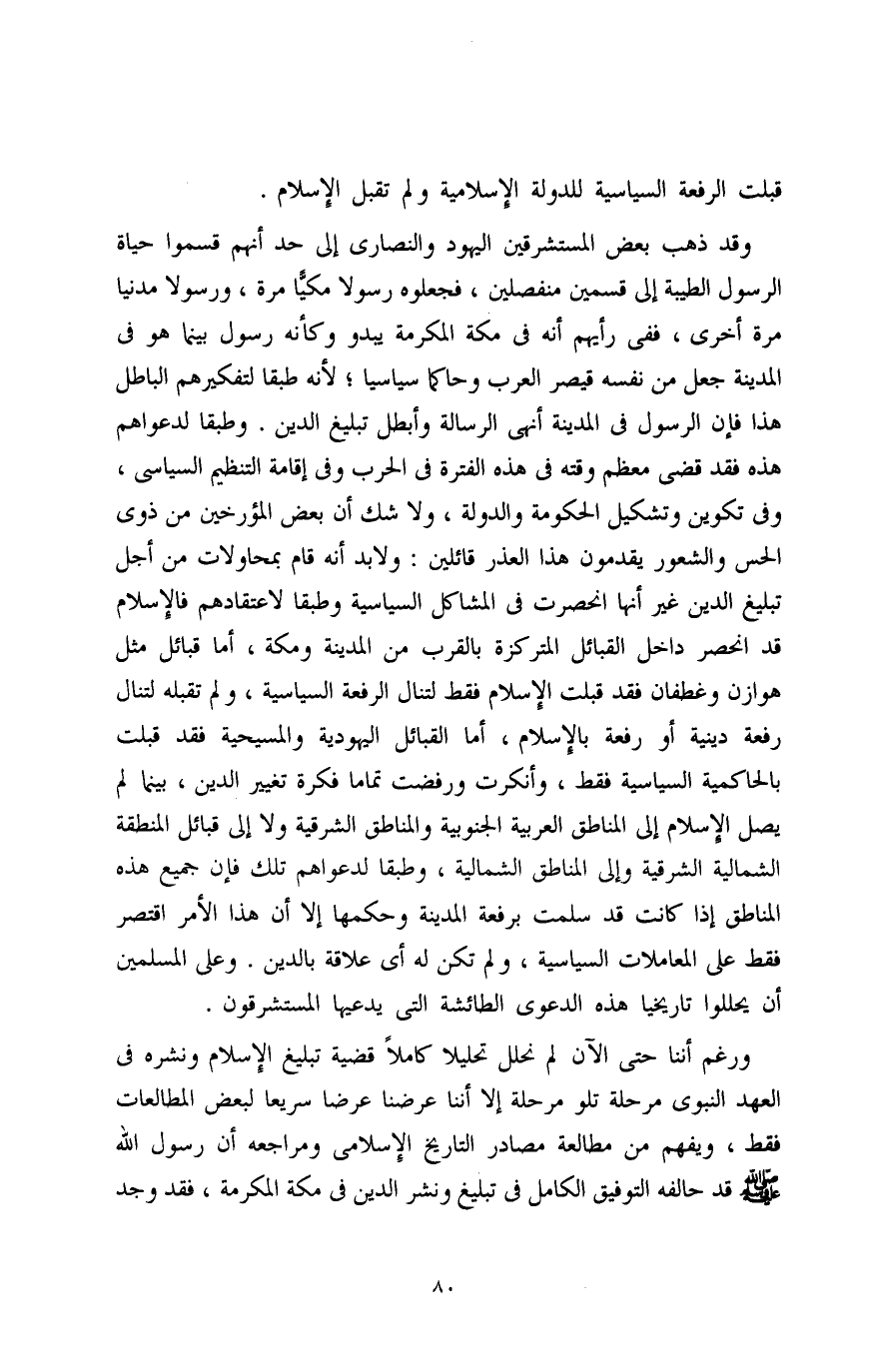 وقد ذهب بعض المستشرقين اليهود والنصارى إلى حد أنهم قسموا حياة الرسول الطيبة إلى قسمين منفصلين، فجعلوه رسولاً مكيًّا مرة، ورسولاً مدنيًا مرة أخرى، ففي رأيهم أنه في مكة المكرمة يبدو وكأنه رسول بينما هو في المدينة جعل من نفسه قيصر العرب وحاكمًا سياسيًا؛ لأنه طبقًا لتفكيرهم الباطل هذا فإن الرسول في المدينة أنهى الرسالة وأبطل تبليغ الدين. وطبقًا لدعواهم هذه فقد قضى معظم وقته في هذه الفترة في الحرب وفي إقامة التنظيم السياسي، وفي تكوين وتشكيل الحكومة والدولة، ولا شك أن بعض المؤرخين من ذوي الحس والشعور يقدمون هذا العذر قائلين: ولابد أنه قام بمحاولات من أجل تبليغ الدين غير أنها انحصرت في المشاكل السياسية وطبقًا لاعتقادهم فالإسلام قد انحصر داخل القبائل المتركزة بالقرب من المدينة ومكة، أما قبائل مثل هوازن وغطفان فقد قبلت الإسلام فقط لتنال الرفعة السياسية، ولم تقبله لتنال رفعة دينية أو رفعة بالإسلام، أما القبائل اليهودية والمسيحية فقد قبلت بالحاكمية السياسية فقط، وأنكرت ورفضت تمامًا فكرة تغيير الدين، بينما لم يصل الإسلام إلى المناطق العربية الجنوبية والمناطق الشرقية ولا إلى قبائل المنطقة الشمالية الشرقية وإلى المناطق الشمالية، وطبقًا لدعواهم تلك فإن جميع هذه المناطق إذا كانت قد سلمت برفعة المدينة وحكمها إلا أن هذا الأمر اقتصر فقط على المعاملات السياسية، ولم تكن له أي علاقة بالدين. وعلى المسلمين أن يحللوا تاريخيًا هذه الدعوى الطائشة التي يدعيها المستشرقون.
