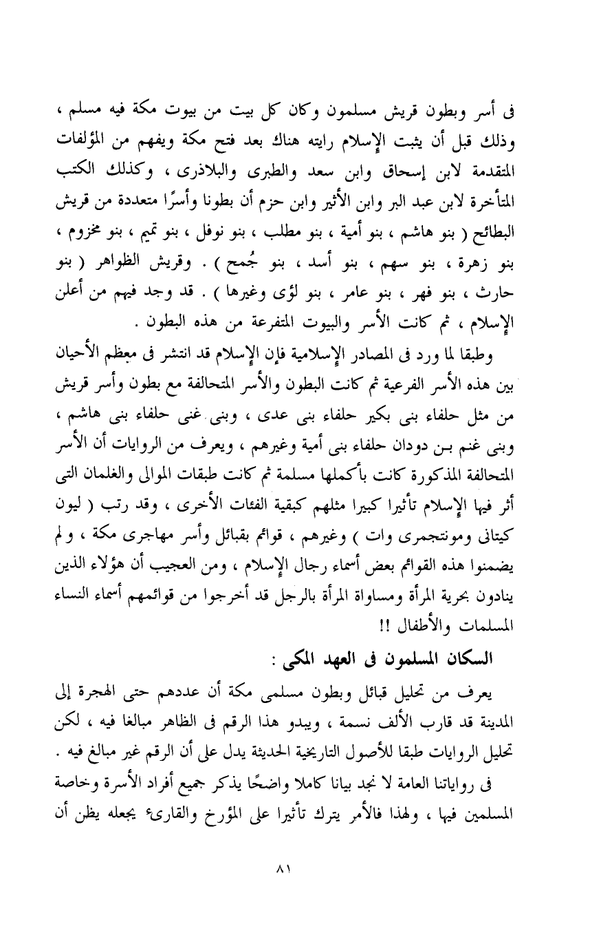 وطبقًا لما ورد في المصادر الإِسلامية فإن الإِسلام قد انتشر في معظم الأحيان بين هذه الأسر الفرعية ثم كانت البطون والأسر المتحالفة مع بطون وأسر قريش من مثل حلفاء بني بكير حلفاء بني عدي، وبني غنى حلفاء بني هاشم، وبني غنم بن دودان حلفاء بني أمية وغيرهم، ويعرف من الروايات أن الأسر المتحالفة المذكورة كانت بأكملها مسلمة ثم كانت طبقات الموالي والغلمان التي أثر فيها الإِسلام تأثيرًا كبيرًا مثلهم كبقية الفئات الأخرى، وقد رتب (ليون كيتاني ومونتجمري وات) وغيرهم، قوائم بقبائل وأسر مهاجري مكة، ولم يضمنوا هذه القوائم بعض أسماء رجال الإسلام، ومن العجيب أن هؤلاء الذين ينادون بحرية المرأة ومساواة المرأة بالرجل قد أخرجوا من قوائمهم أسماء النساء المسلمات والأطفال!!