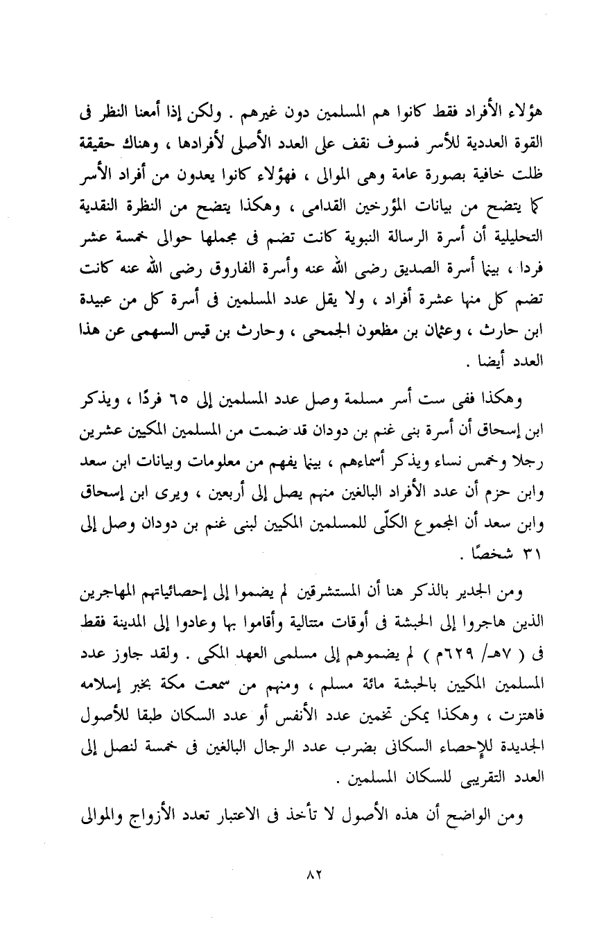 ومن الجدير بالذكر هنا أن المستشرقين لم يضموا إلى إحصائياتهم المهاجرين الذين هاجروا إلى الحبشة في أوقات متتالية وأقاموا بها وعادوا إلى المدينة فقط في (7 هـ/ 629 م) لم يضموهم إلى مسلمي العهد المكي. ولقد جاوز عدد المسلمين المكيين بالحبشة مائة مسلم، ومنهم من سمعت مكة بخبر إسلامه فاهتزت، وهكذا يمكن تخمين عدد الأنفس أو عدد السكان طبقًا للأصول الجديدة للإِحصاء السكاني بضرب عدد الرجال البالغين في خمسة لنصل إلى العدد التقريبي للسكان المسلمين.