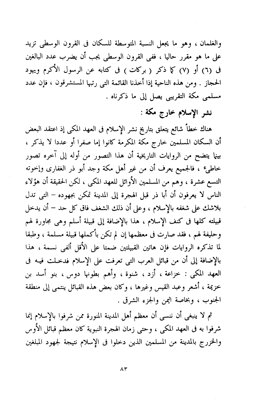 والغلمان، وهو ما يجعل النسبة المتوسطة للسكان في القرون الوسطى تزيد على ما هو مقرر حاليًا، ففي القرون الوسطى يجب أن يضرب عدد البالغين في (6) أو (7) كما ذكر (بركات) في كتابه عن الرسول الأكرم ويهود الحجاز. ومن هذه الناحية إذا أخذنا القائمة التي رتبها المستشرقون، فإن عدد مسلمي مكة التقريبي يصل إلى ما ذكرناه.