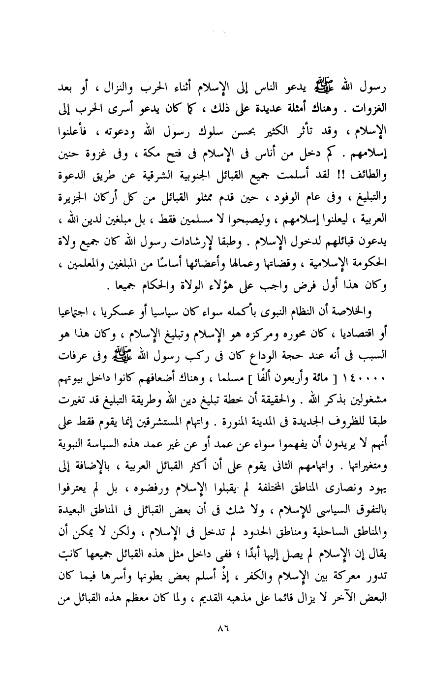 والخلاصة أن النظام النبوي بأكمله سواء كان سياسيًا أو عسكريًا، اجتماعيًا أو اقتصاديًا، كان محوره ومركزه هو الإسلام وتبليغ الإسلام، وكان هذا هو السبب في أنه عند حجة الوداع كان في ركب رسول الله صلى الله عليه وسلم وفي عرفات 140000 [مائة وأربعون ألفًا] مسلمًا، وهناك أضعافهم كانوا داخل بيوتهم مشغولين بذكر الله. والحقيقة أن خطة تبليغ دين الله وطريقة التبليغ قد تغيرت طبقًا للظروف الجديدة في المدينة المنورة. واتهام المستشرقين إنما يقوم فقط على أنهم لا يريدون أن يفهموا سواء عن عمد أو عن غير عمد هذه السياسة النبوية ومتغيراتها. واتهامهم الثاني يقوم على أن أكثر القبائل العربية، بالإضافة إلى يهود ونصارى المناطق المختلفة لم يقبلوا الإسلام ورفضوه، بل لم يعترفوا بالتفوق السياسي للإسلام، ولا شك في أن بعض القبائل في المناطق البعيدة والمناطق الساحلية ومناطق الحدود لم تدخل في الإسلام، ولكن لا يمكن أن يقال إن الإسلام لم يصل إليها أبدًا؛ ففي داخل مثل هذه القبائل جميعها كانت تدور معركة بين الإسلام والكفر، إذْ أسلم بعض بطونها وأسرها فيما كان البعض الآخر لا يزال قائمًا على مذهبه القديم، ولما كان معظم هذه القبائل من