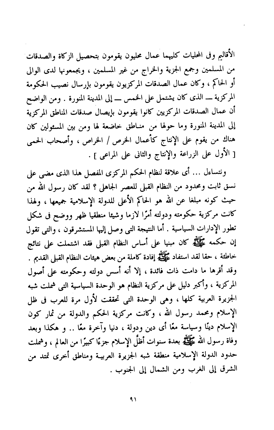 وقد أقرها ما دامت ذات فائدة، إلا أنه أسس دولته وحكومته على أصول المركزية، وأكبر دليل على مركزية النظام هو الوحدة السياسية التي شملت شبه الجزيرة العربية كلها، وهي الوحدة التي تحققت لأول مرة للعرب في ظل الإسلام ومحمد رسول الله، وكانت مركزية الحكم والدولة من ثمار كون الإسلام دينًا وسياسة معًا أي دين ودولة، دنيا وآخرة معًا .. وهكذا وبعد وفاة رسول الله صلى الله عليه وسلم بعدة سنوات أظلَّ الإسلام جزءًا كبيرًا من العالم، وشملت حدود الدولة الإسلامية منطقة شبه الجزيرة العربية ومناطق أخرى تمتد من الشرق إلى الغرب ومن الشمال إلى الجنوب.
