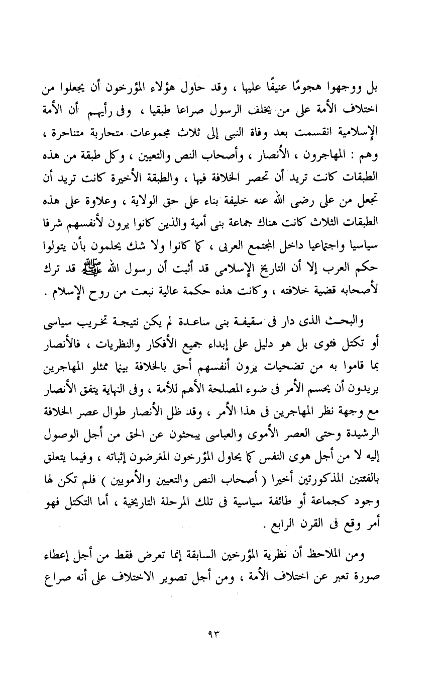 بل ووجهوا هجومًا عنيفًا عليها، وقد حاول هؤلاء المؤرخون أن يجعلوا من اختلاف الأمة على من يخلف الرسول صراعًا طبقيًا، وفي رأيهم أن الأمة الإسلامية انقسمت بعد وفاة النبي إلى ثلاث مجموعات متحاربة متناحرة، وهم: المهاجرون، الأنصار، وأصحاب النص والتعيين، وكل طبقة من هذه الطبقات كانت تريد أن تحصر الخلافة فيها، والطبقة الأخيرة كانت تريد أن تجعل من علي رضى الله عنه خليفة بناء على حق الولاية، وعلاوة على هذه الطبقات الثلاث كانت هناك جماعة بني أمية والذين كانوا يرون لأنفسهم شرفًا سياسيًا واجتماعيًا داخل المجتمع العربي، كما كانوا ولا شك يحلمون بأن يتولوا حكم العرب إلا أن التاريخ الإسلامي قد أثبت أن رسول الله صلى الله عليه وسلم قد ترك لأصحابه قضية خلافته، وكانت هذه حكمة عالية نبعت من روح الإسلام.