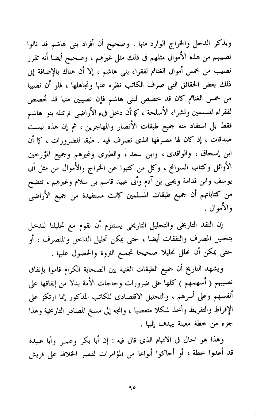 ويذكر الدخل والخراج الوارد منها. وصحيح أن أفراد بني هاشم قد نالوا نصيبهم من هذه الأموال مثلهم في ذلك مثل غيرهم، وصحيح أيضًا أنه تقرر نصيب من خمس أموال الغنائم لفقراء بني هاشم، إلا أن هناك بالإِضافة إلى ذلك بعض الحقائق التي صرف الكاتب نظره عنها وتجاهلها، فلو أن نصيبًا من خمس الغنائم كان قد خصص لبني هاشم فإن نصيبين منها قد خُصص لفقراء المسلمين ولشراء الأسلحة، كما أن دخل فيء الأراضى لم تنله بنو هاشم فقط بل استفاد منه جميع طبقات الأنصار والمهاجرين، ثم إن هذه ليست صدقات، إذ كان لها مصرفها الذي تصرف فيه. طبقًا للضرورات، كما أن ابن إسحاق، والواقدي، وابن سعد، والطبري وغيرهم وجميع المؤرخين الأوائل وكتاب السوانح، وكل من كتبوا عن الخراج والأموال من مثل أبي يوسف وابن قدامة ويحيى بن آدم وأبي عبيد قاسم بن سلام وغيرهم، تتضح من كتاباتهم أن جميع طبقات المسلمين كانت مستفيدة من جميع الأراضي والأموال.