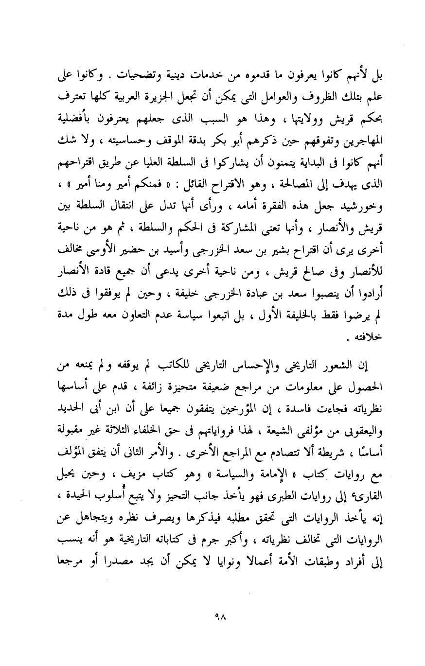 إن الشعور التاريخي والاحساس التاريخي للكاتب لم يوقفه ولم يمنعه من الحصول على معلومات من مراجع ضعيفة متحيزة زائفة، قدم على أساسها نظرياته فجاءت فاسدة، إن المؤرخين يتفقون جميعًا على أن ابن أبي الحديد واليعقوبي من مؤلفي الشيعة، لهذا فرواياتهم في حق الخلفاء الثلاثة غير مقبولة أساسًا، شريطة ألا تتصادم مع المراجع الأخرى. والأمر الثاني أن يتفق المؤلف مع روايات كتاب " الإمامة والسياسة " وهو كتاب مزيف، وحين يحيل القارىء إلى روايات الطبري فهو يأخذ جانب التحيز ولا يتبع أسلوب الحيدة، إنه يأخذ الروايات التي تحقق مطلبه فيذكرها ويصرف نظره ويتجاهل عن الروايات التي تخالف نظرياته، وأكبر جرم في كتاباته التاريخية هو أنه ينسب إلى أفراد وطبقات الأمة أعمالاً ونوايا لا يمكن أن يجد مصدرًا أو مرجعًا