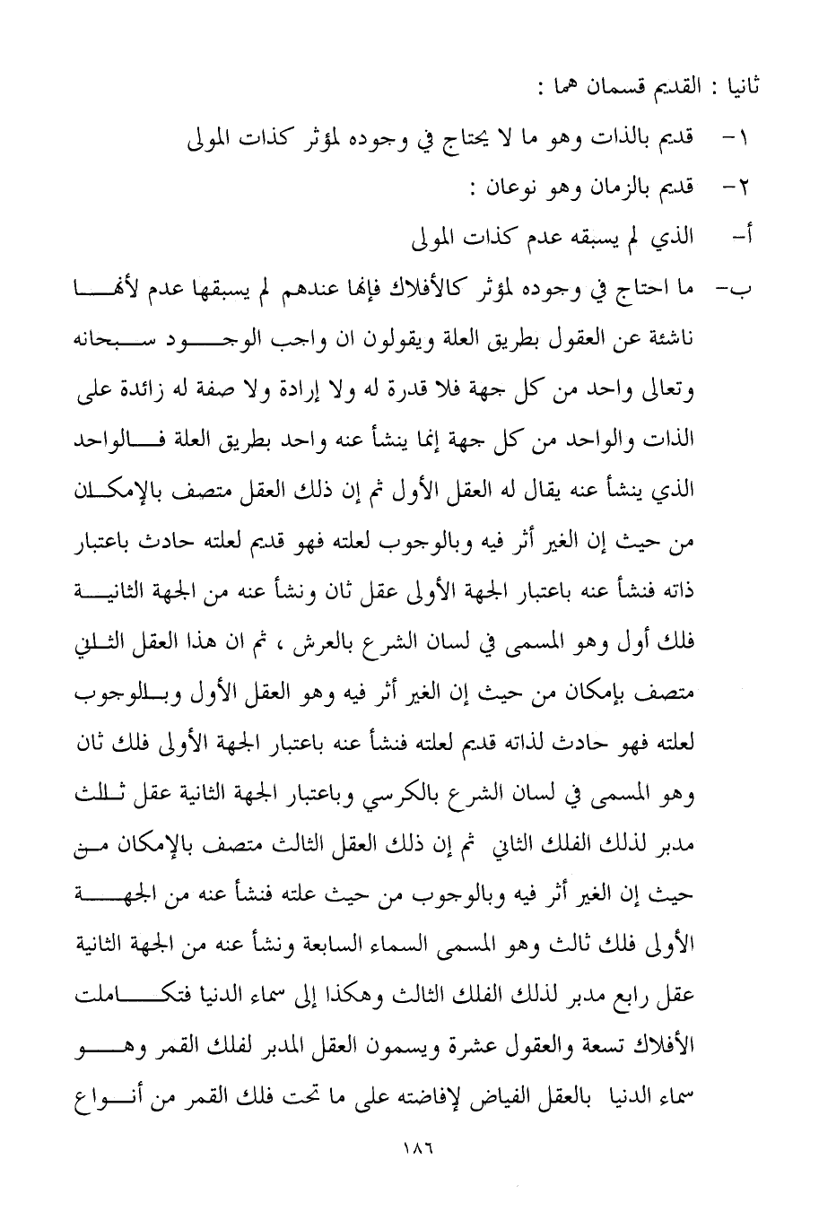 ما احتاج في وجوده لمؤثر كالأفلاك فإنها عندهم لم يسبقها عدم لأنها ناشئة عن العقول بطريق العلة ويقولون ان واجب الوجود سبحانه وتعالى واحد من كل جهة فلا قدرة له ولا إرادة ولا صفة له زائدة على الذات والواحد من كل جهة إنما ينشأ عنه واحد بطريق العلة فالواحد الذي ينشأ عنه يقال له العقل الأول ثم إن ذلك العقل متصف بالإمكان من حيث إن الغير أثر فيه وبالوجوب لعلته فهو قديم لعلته حادث باعتبار ذاته فنشأ عنه باعتبار الجهة الأولى عقل ثان ونشأ عنه من الجهة الثانية فلك أول وهو المسمى في لسان الشرع بالعرش، ثم ان هذا العقل الثاني متصف بإمكان من حيث إن الغير أثر فيه وهو العقل الأول وبالوجوب لعلته فهو حادث لذاته قديم لعلته فنشأ عنه باعتبار الجهة الأولى فلك ثان وهو المسمى في لسان الشرع بالكرسي وباعتبار الجهة الثانية عقل ثالث مدبر لذلك الفلك الثاني ثم إن ذلك العقل الثالث متصف بالإمكان من حيث إن الغير أثر فيه وبالوجوب من حيث علته فنشأ عنه من الجهة الأولى فلك ثالث وهو المسمى السماء السابعة ونشأ عنه من الجهة الثانية عقل رابع مدبر لذلك الفلك الثالث وهكذا إلى سماء الدنيا فتكاملت الأفلاك تسعة والعقول عشرة ويسمون العقل المدبر لفلك القمر وهو سماء الدنيا بالعقل الفياض لإفاضته على ما تحت فلك القمر من أنواع