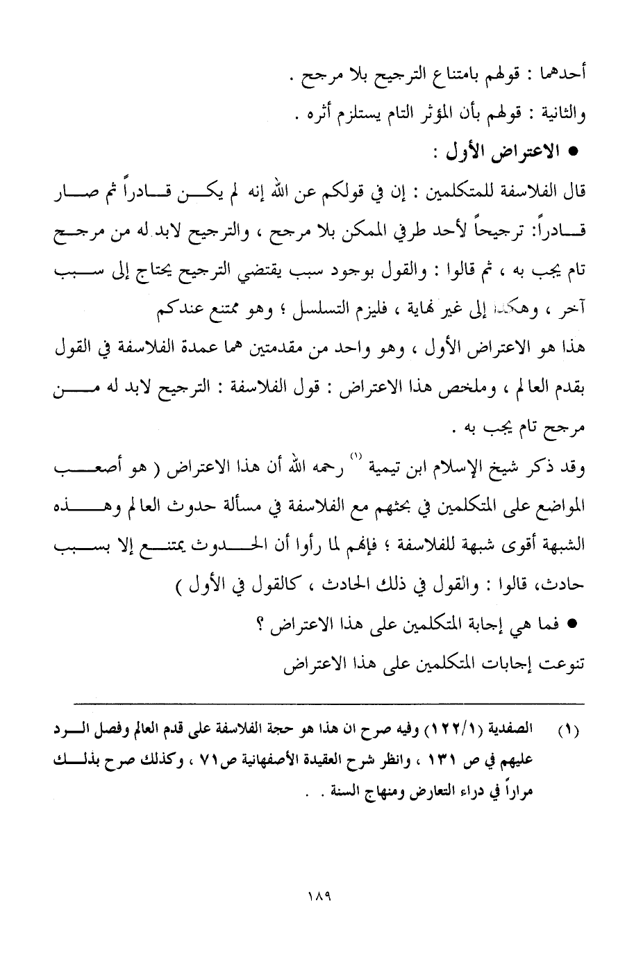 (¬1) الصفدية (1/122) وفيه صرح ان هذا هو حجة الفلاسفة على قدم العالم وفصل الرد عليهم في ص 131، وانظر شرح العقيدة الأصفهانية ص71، وكذلك صرح بذلك مراراً في دراء التعارض ومنهاج السنة. .