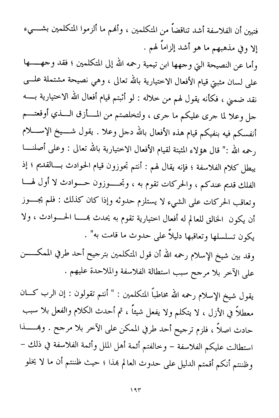 يقول شيخ الإسلام رحمه الله مخاطباً المتكلمين: " أنتم تقولون: إن الرب كان معطلاً في الأزل، لا يتكلم ولا يفعل شيئاً، ثم أحدث الكلام والفعل بلا سبب حادث اصلاً، فلزم ترجيح أحد طرفي الممكن على الآخر بلا مرجح. وبهذا استطالت عليكم الفلاسفة - وخالفتم أئمة أهل الملل وأئمة الفلاسفة في ذلك - وظننتم أنكم أقمتم الدليل على حدوث العالم بهذا؛ حيث ظننتم أن ما لا يخلو